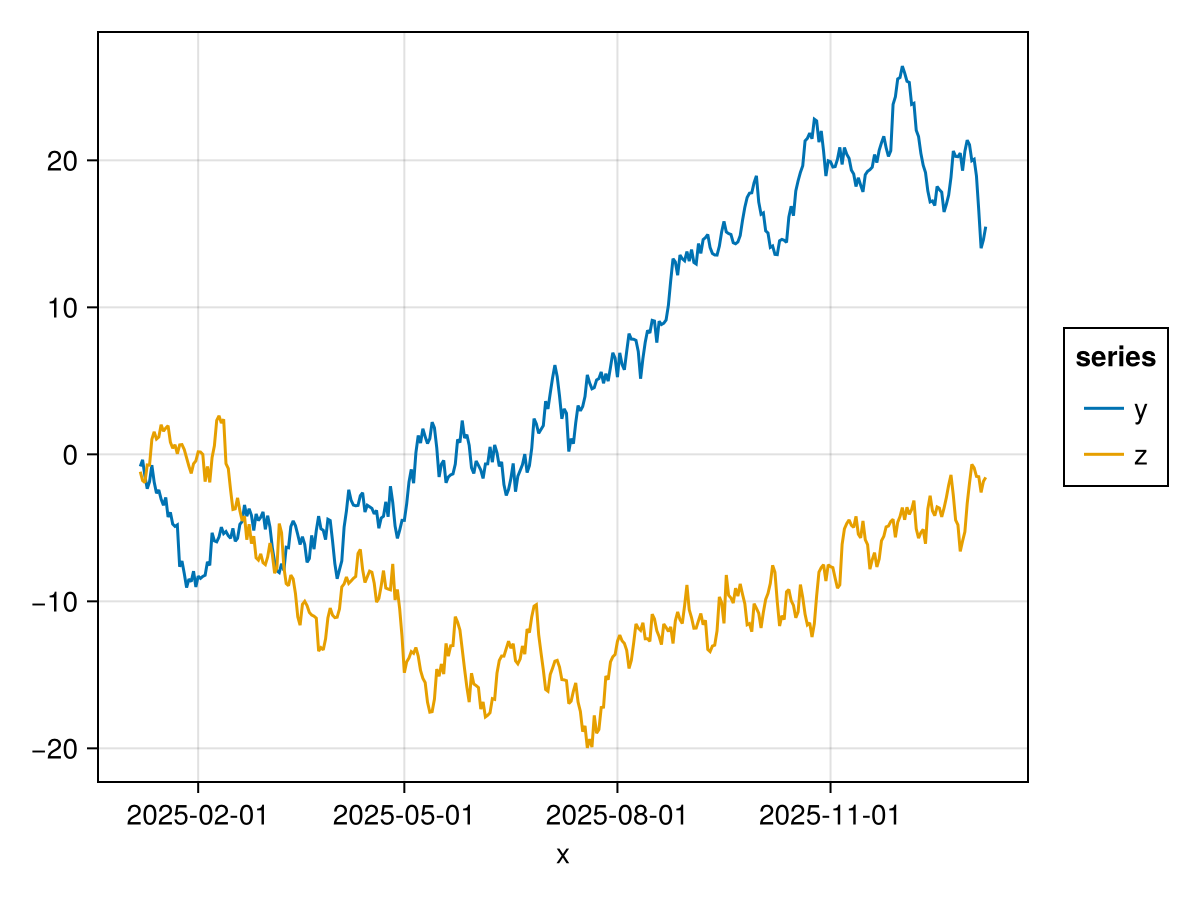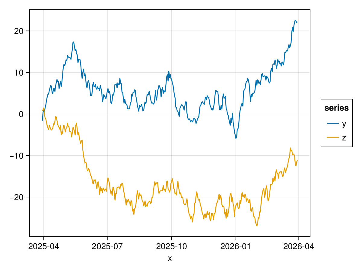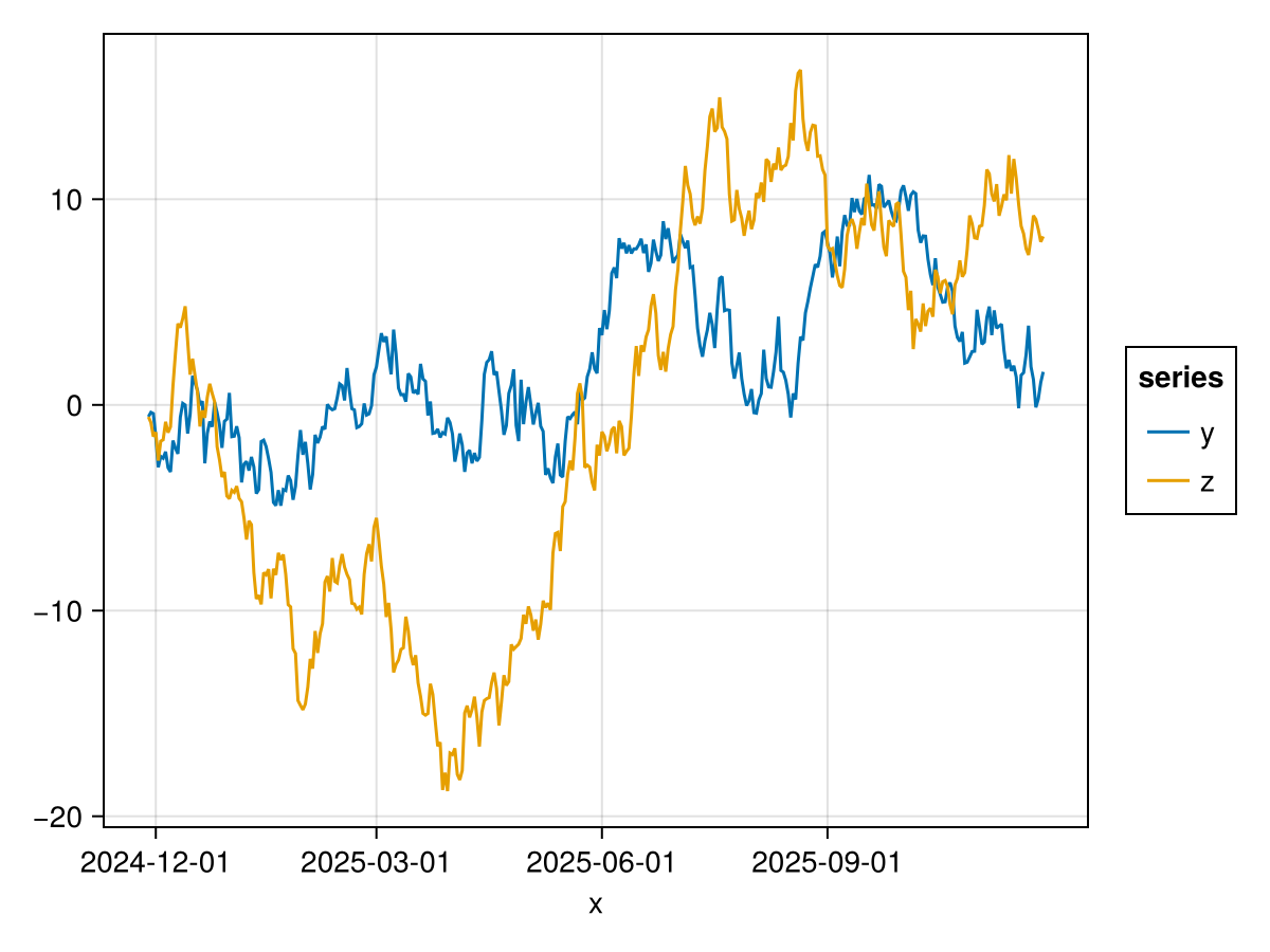 mapping(:x, [:y, :z], color=dims(1) => "series") *