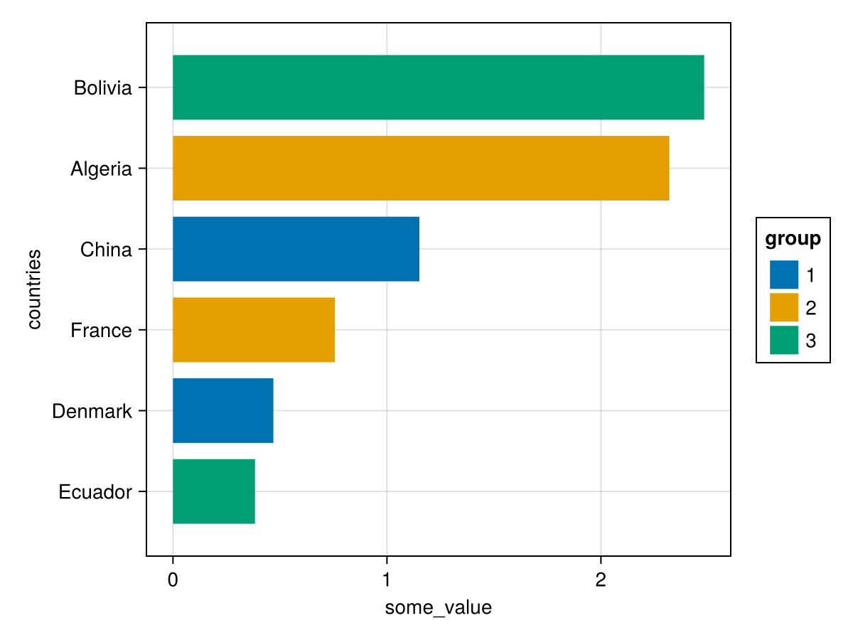 using AlgebraOfGraphics, CairoMakie, DataFramesSometimes we have datasets that have an inherent order we want to preserve. For example, this dataframe has countries sorted by some_value.