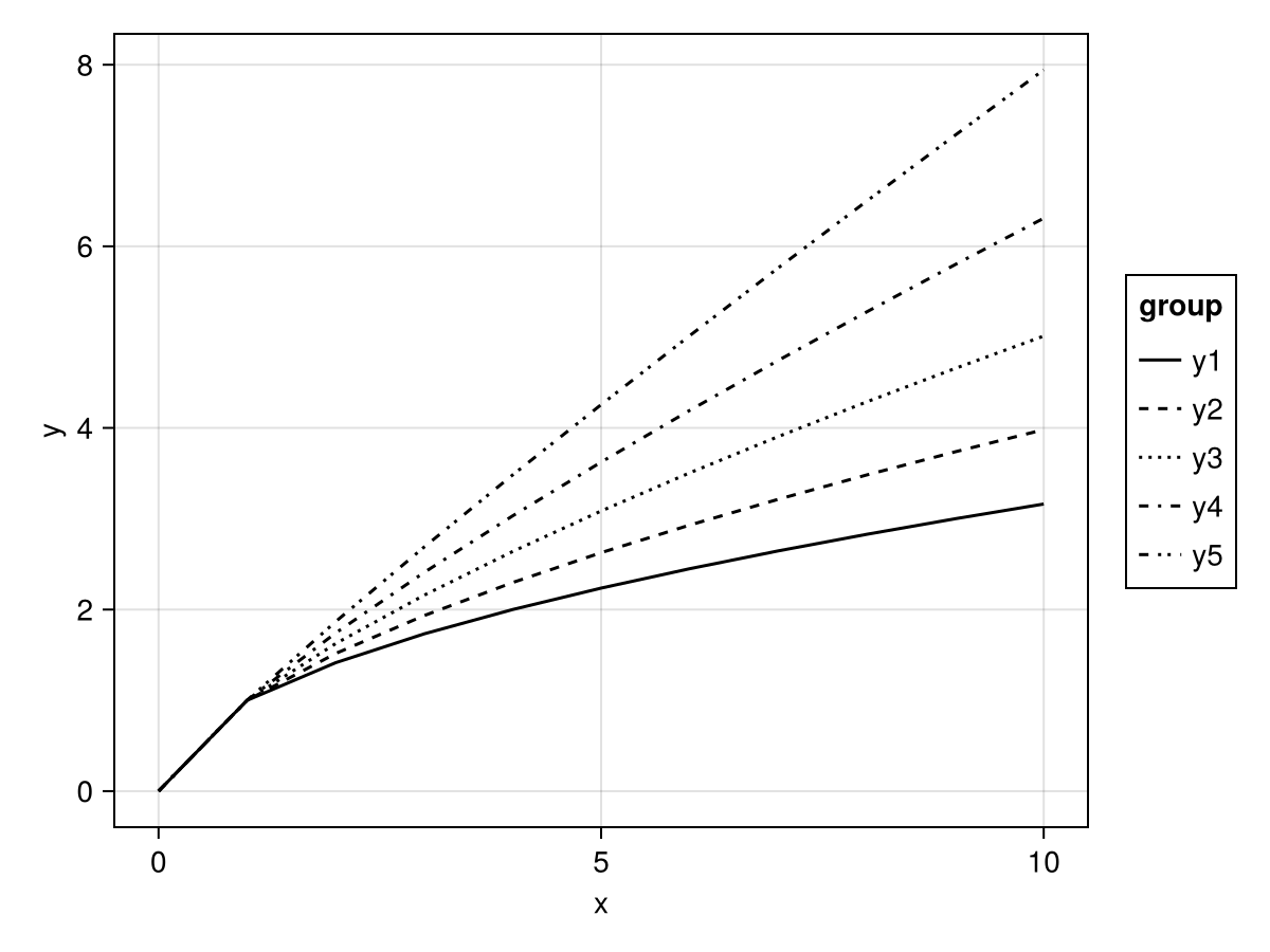 df_long = stack(df_wide, ys, variable_name = :group, value_name = :y)Example 1: Lines without color differentiation