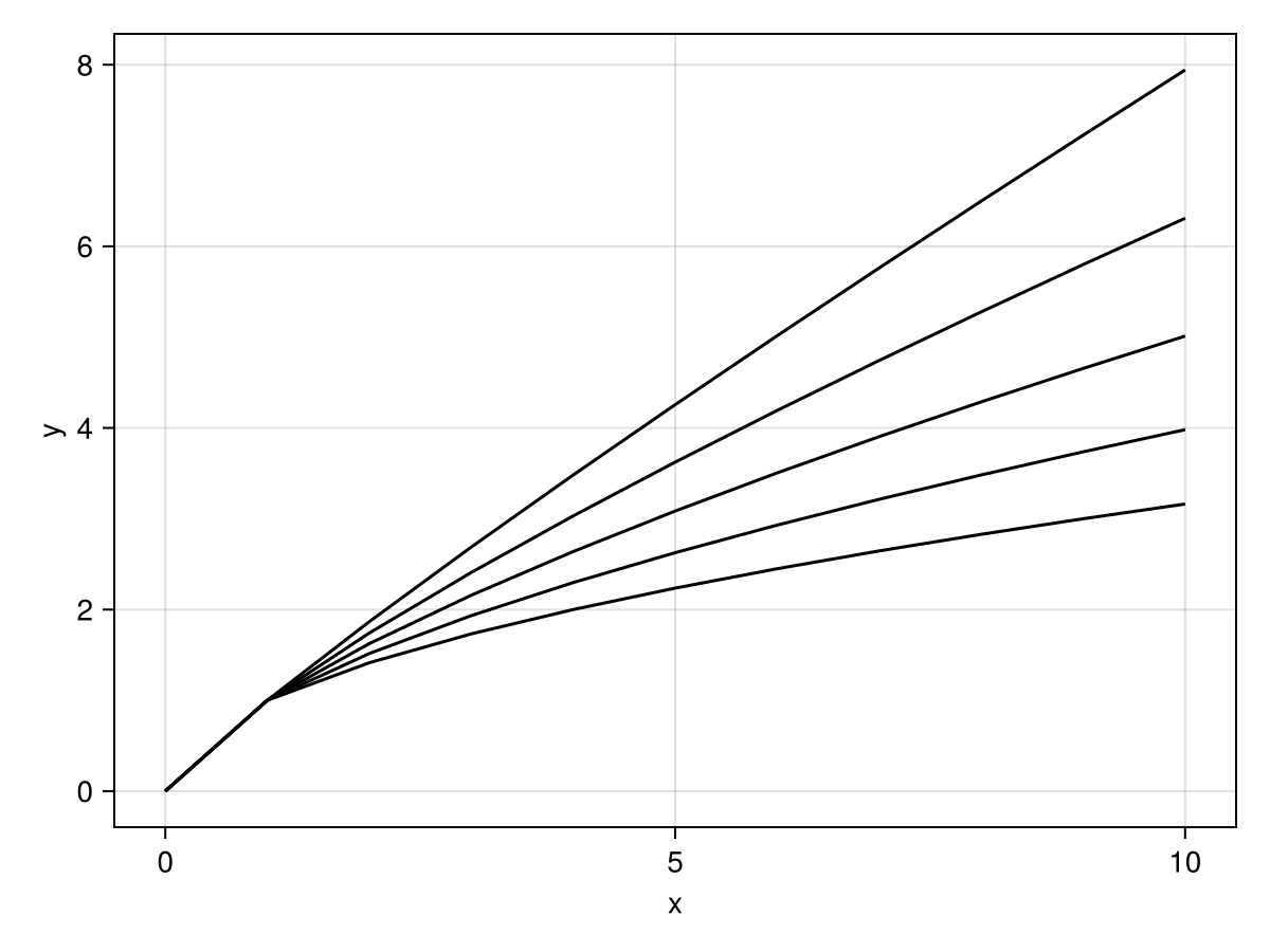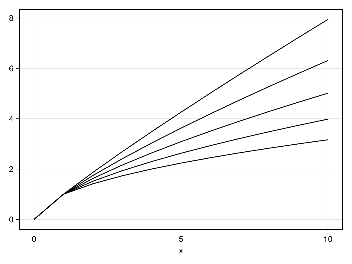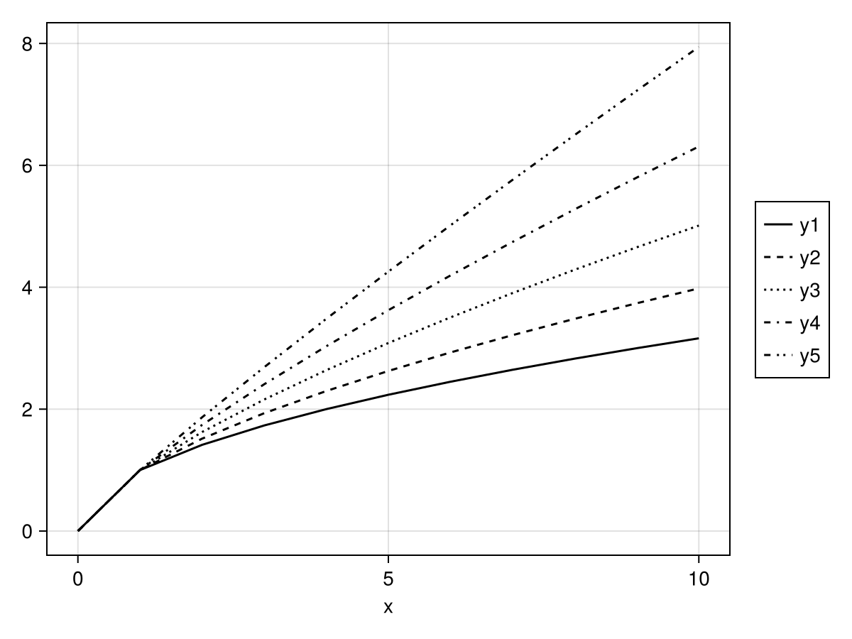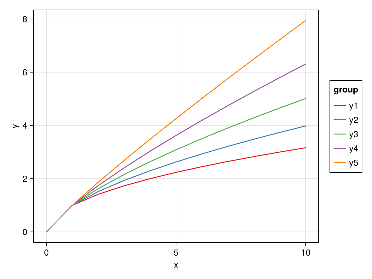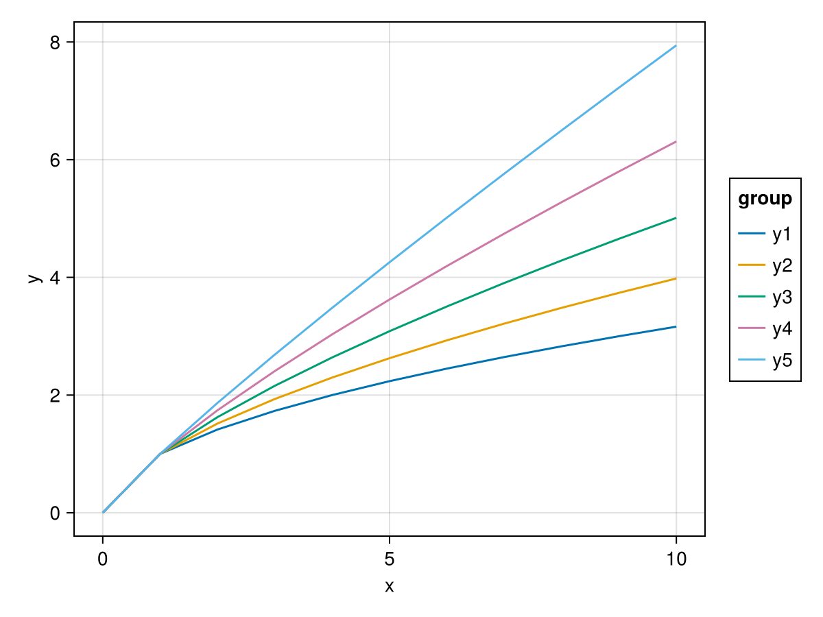 df_wide[!, "y$i"] = df_wide.x .^ (0.4 + i * 0.1)