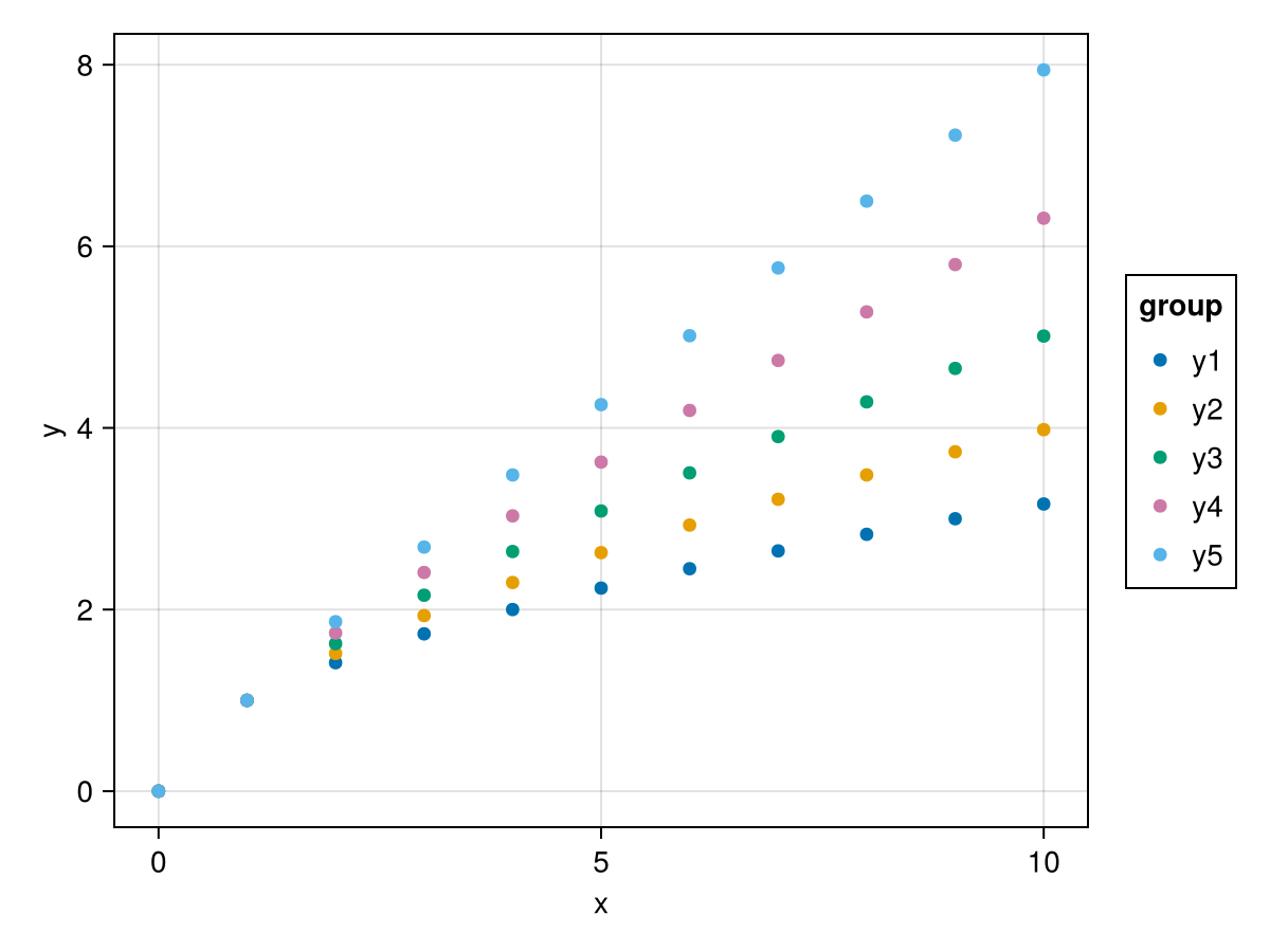 data(df_long) * mapping(:x, :y, color = :group) * visual(Scatter) |> draw