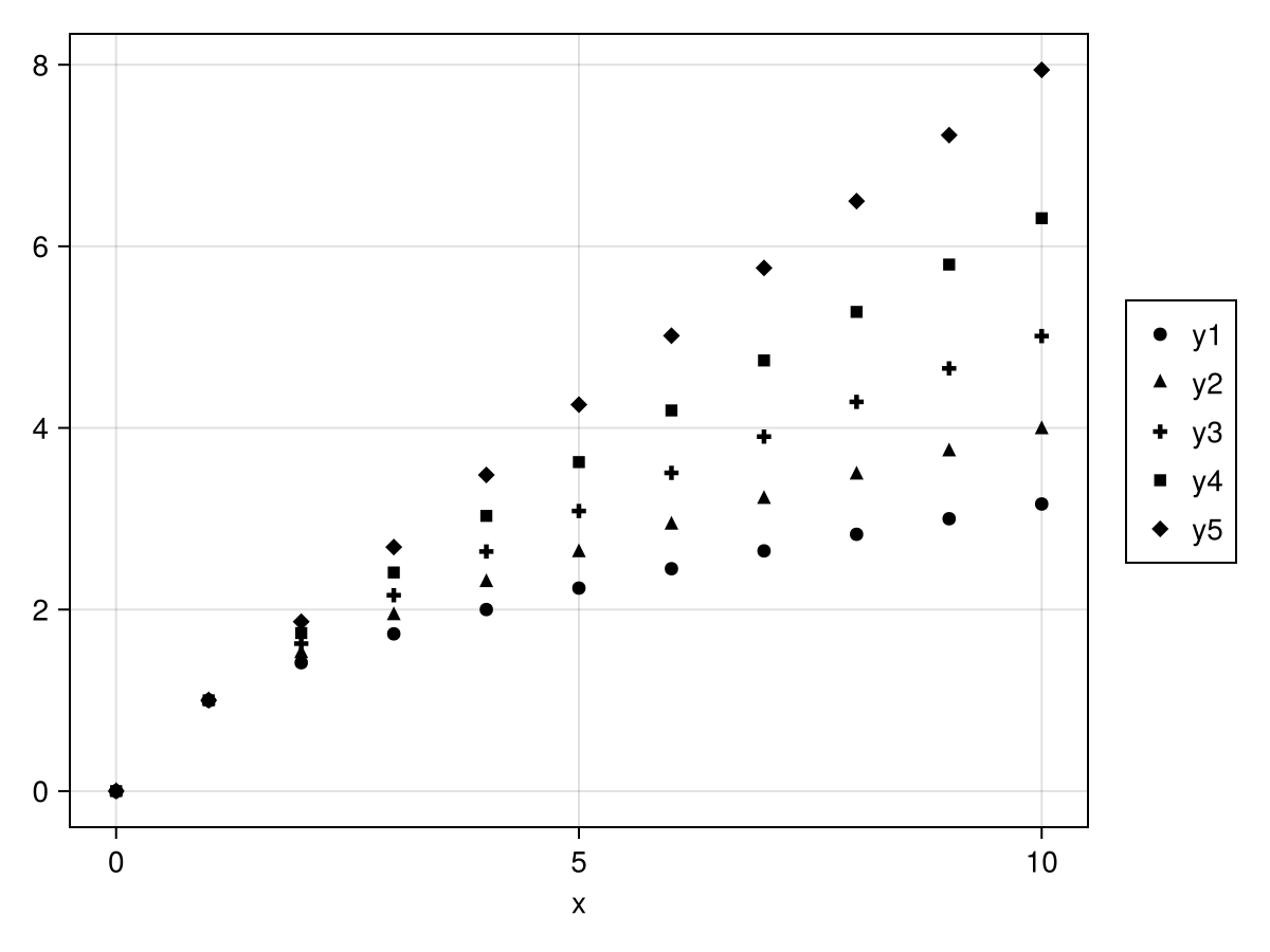 data(df_wide) * mapping(:x, ys, marker = dims(1)) * visual(Scatter) |> draw
