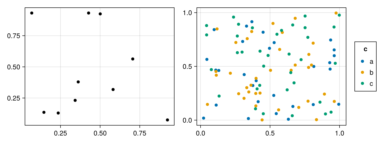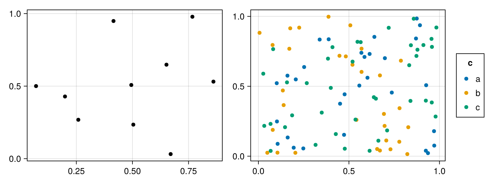 df = (x=rand(100), y=rand(100), c=rand(["a", "b", "c"], 100))