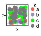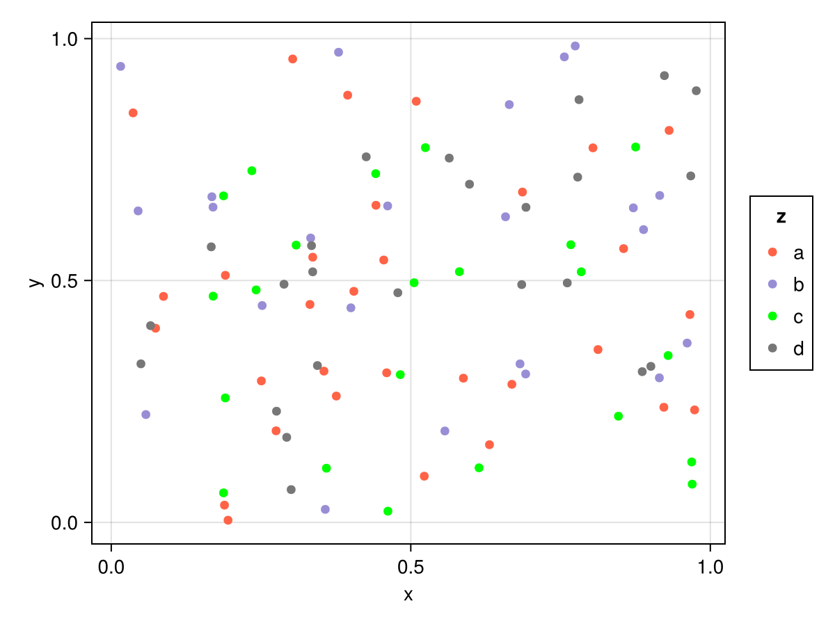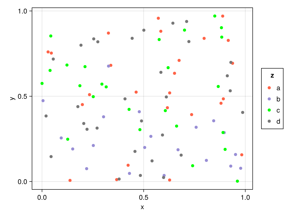 colors = ["a" => :tomato, "c" => :lime, colorant"#988ED5", colorant"#777777"]