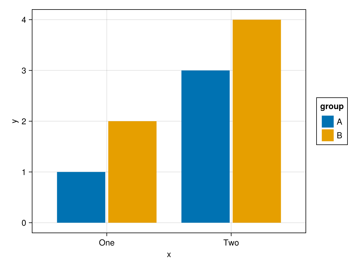 plt = data(df) * mapping(:x, :y, dodge = :group, color = :group) * visual(BarPlot)