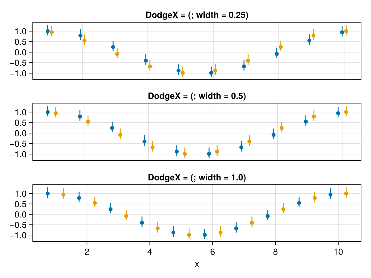 draw!(f[3, 1], plt3, scales(DodgeX = (; width = 1.0)); axis = (; title = "DodgeX = (; width = 1.0)"))