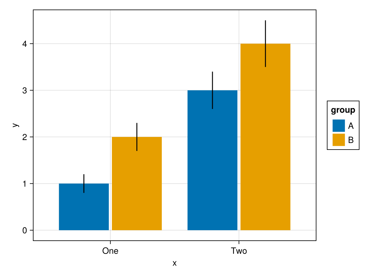 df = (; x = ["One", "One", "Two", "Two"], y = 1:4, err = [0.2, 0.3, 0.4, 0.5], group = ["A", "B", "A", "B"])