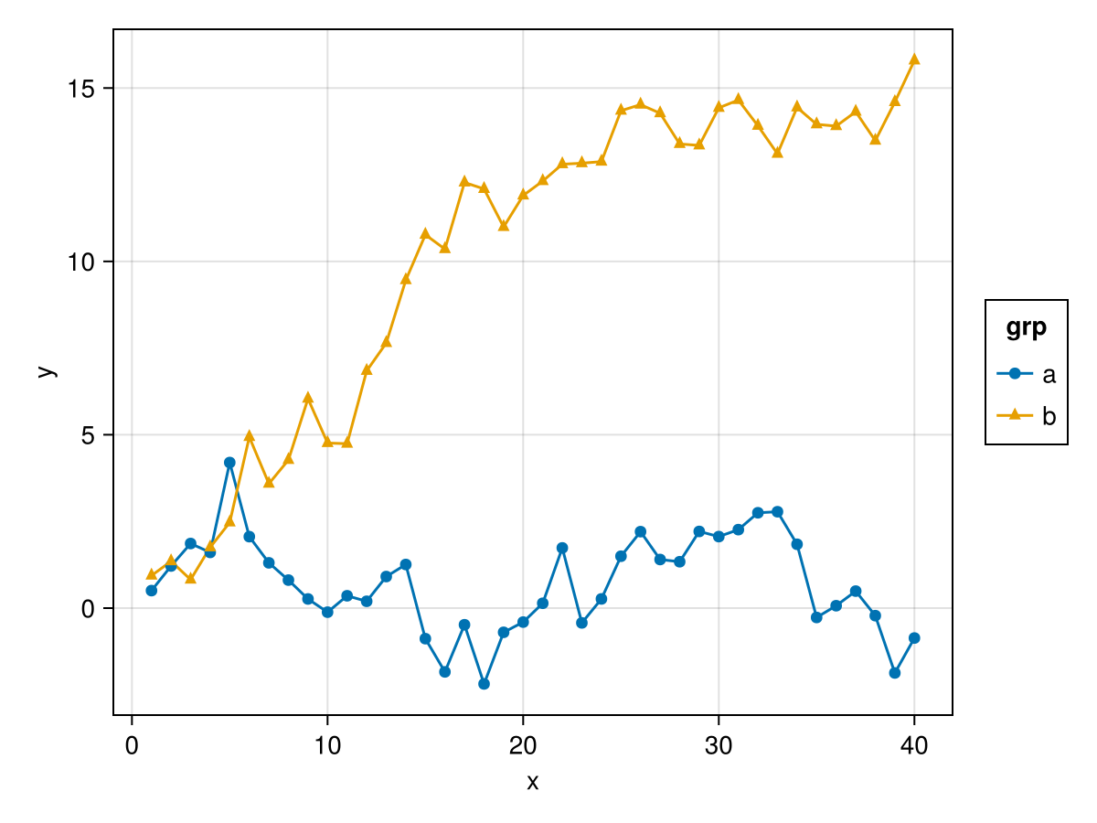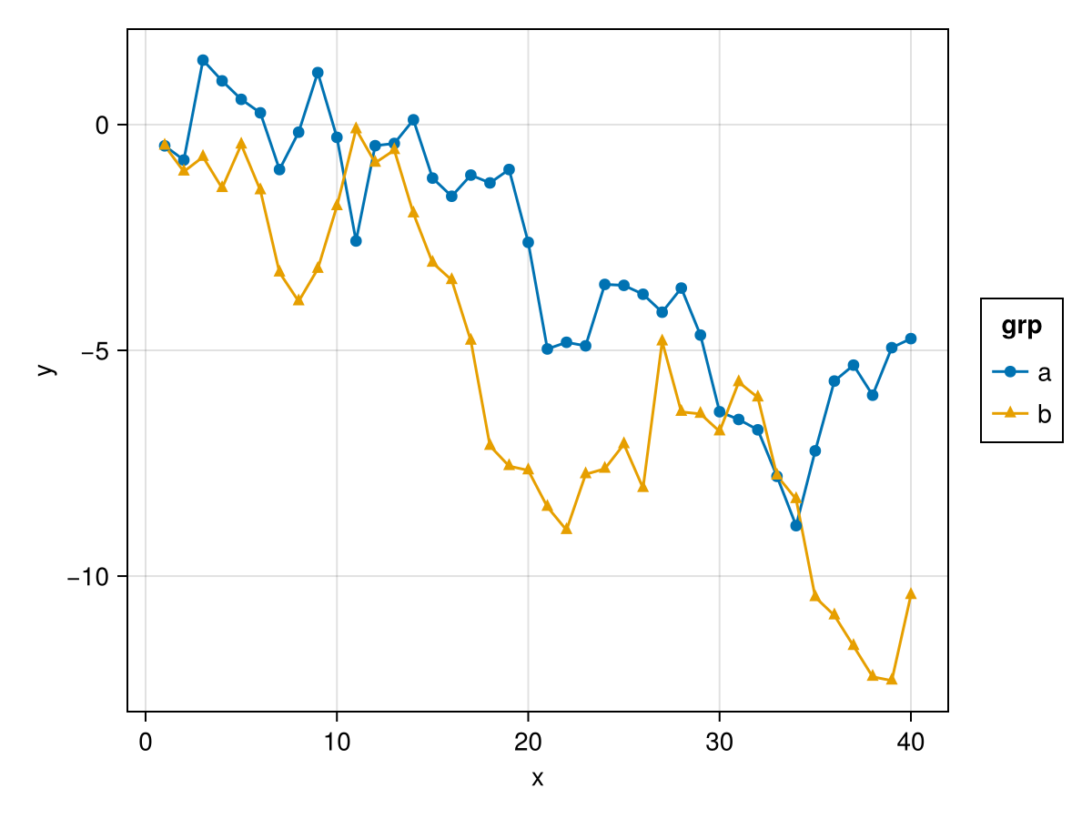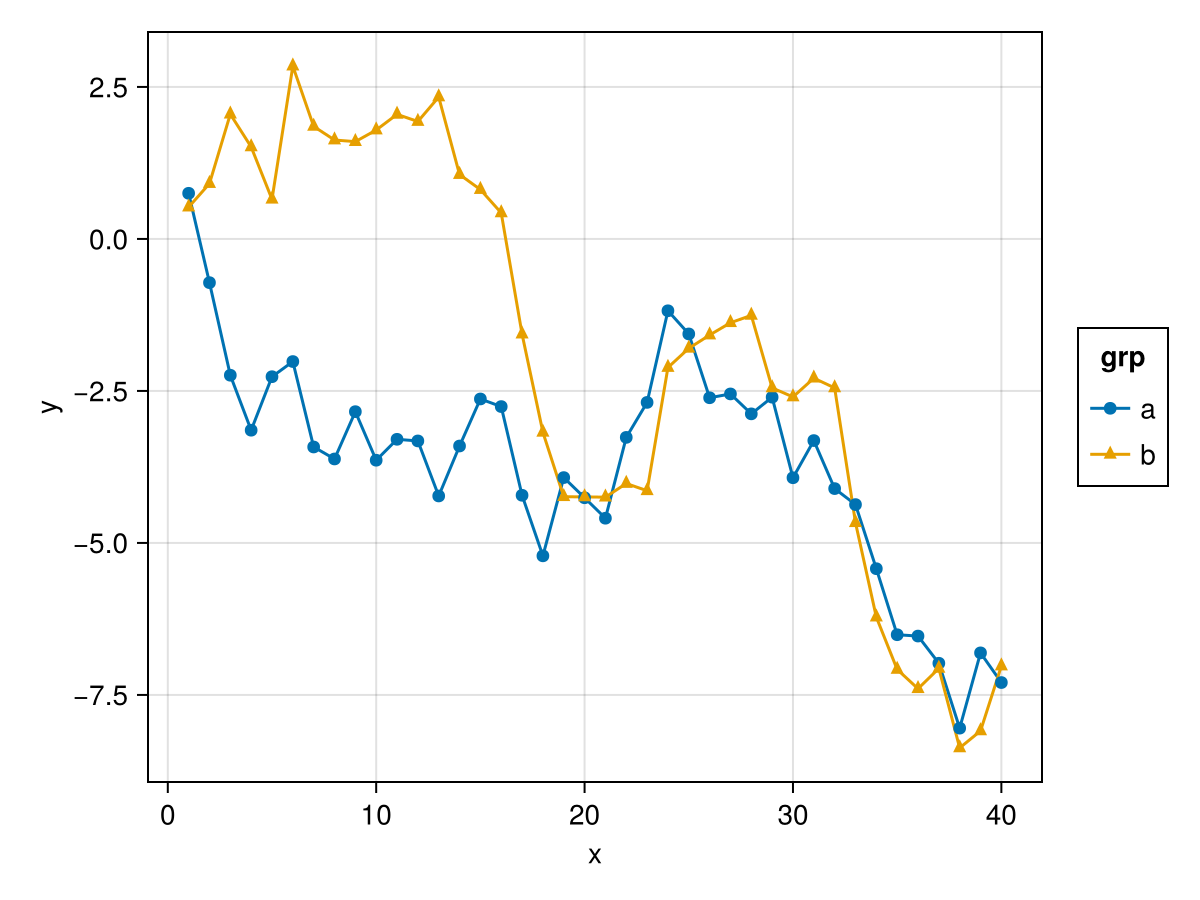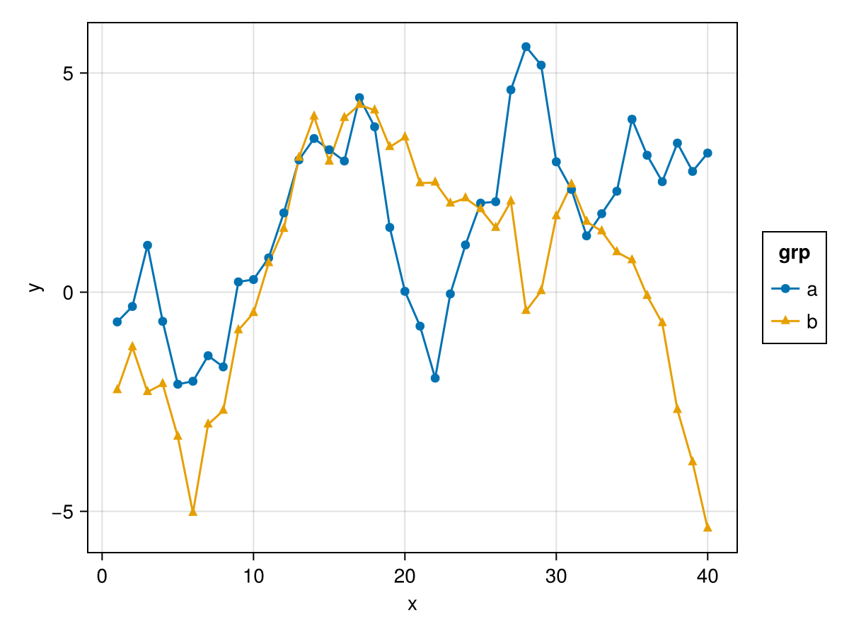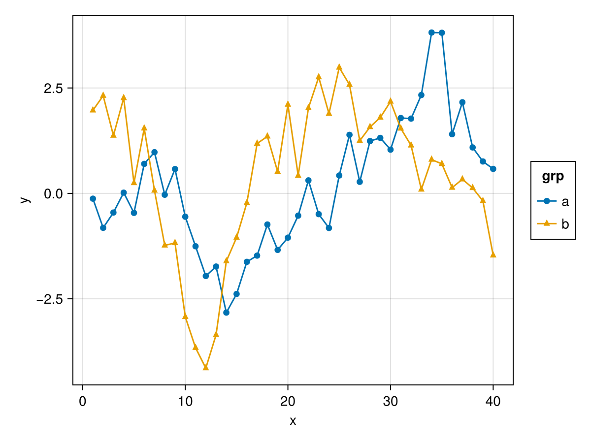 plt = data(df) * layers * mapping(:x, :y, color = :grp)