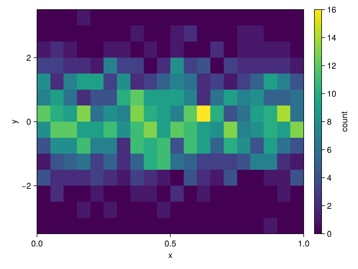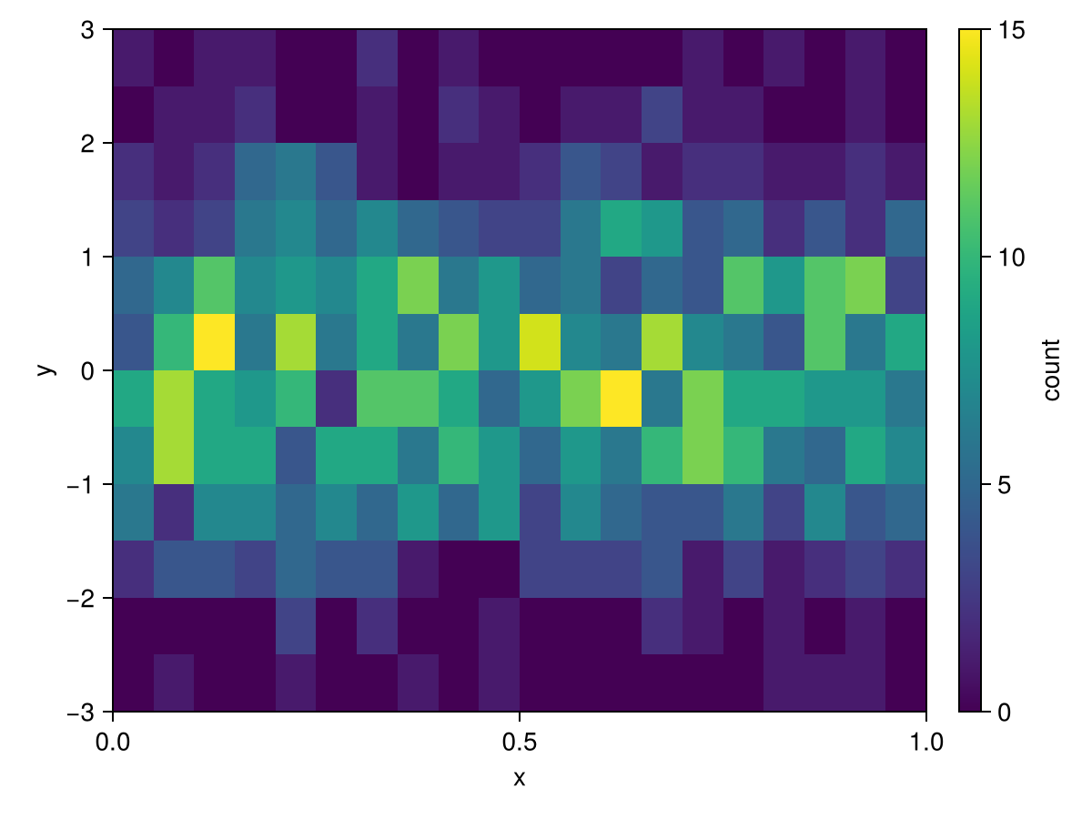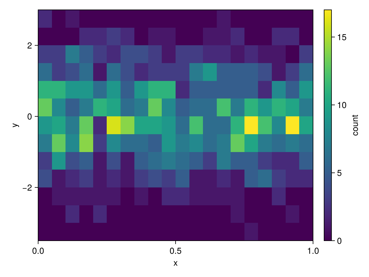 plt = data(df) * mapping(:x, :y) * histogram(bins=20)