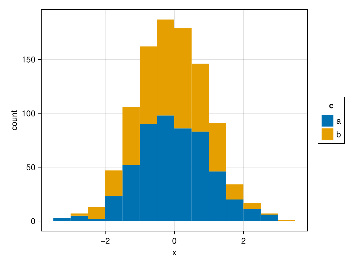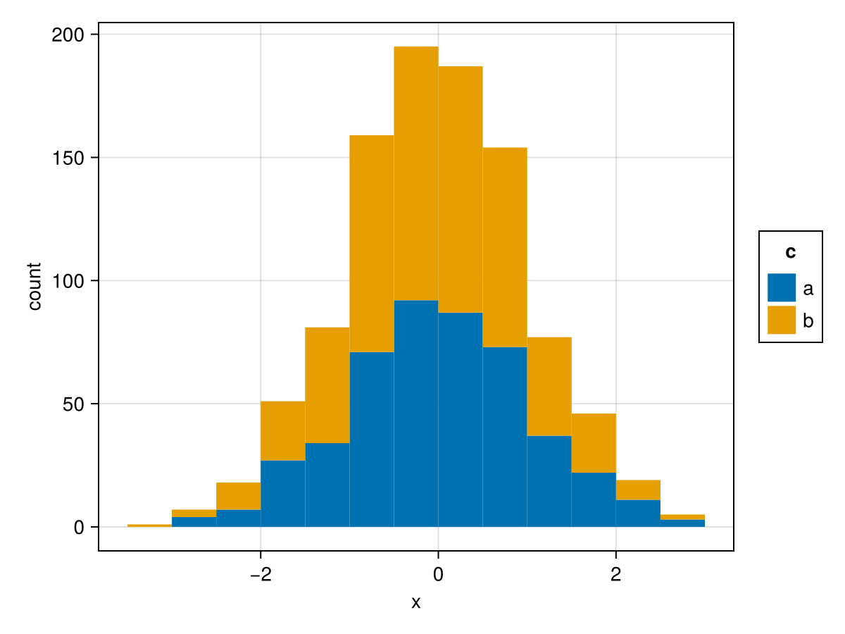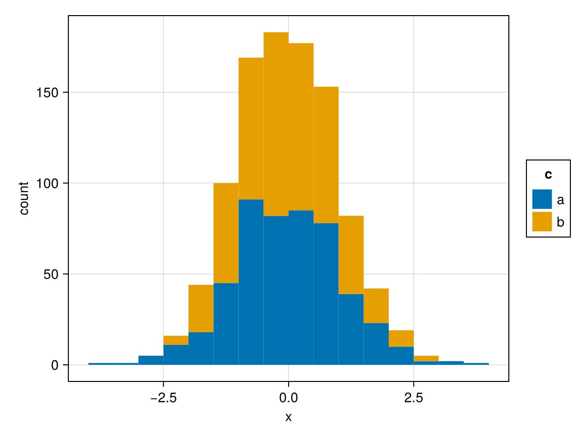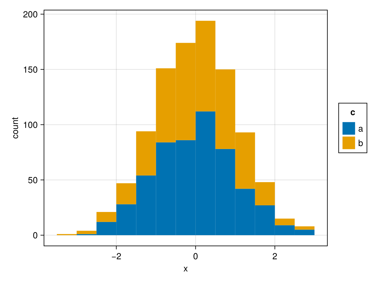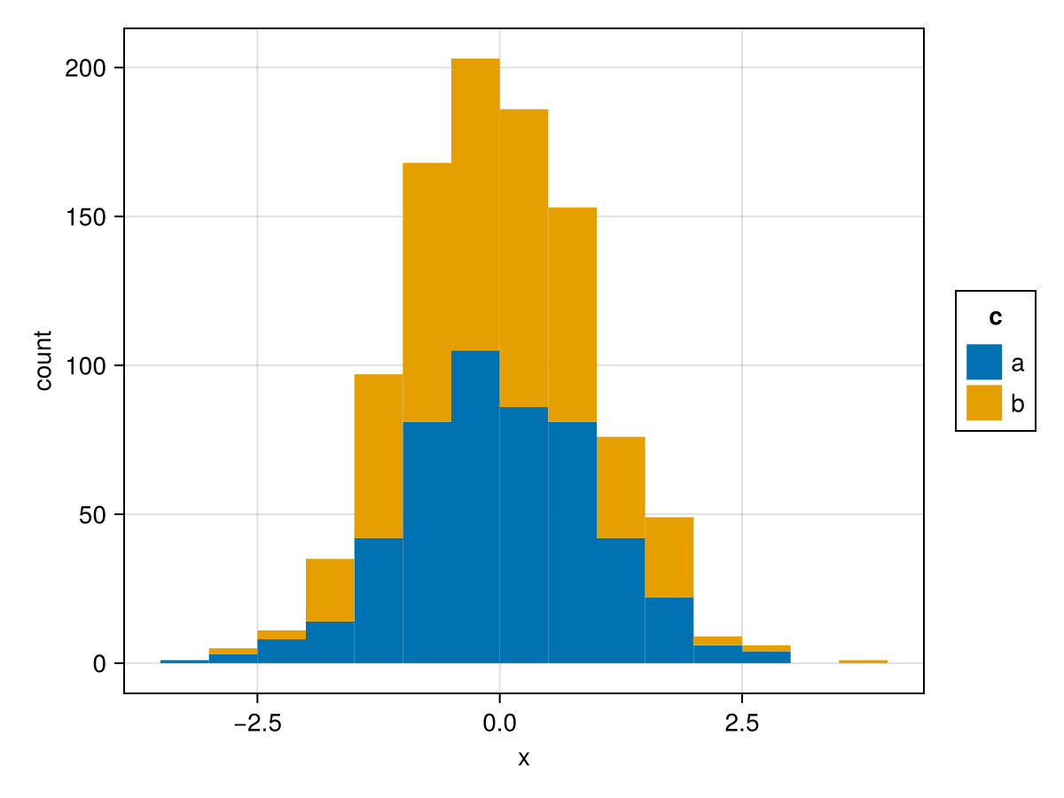 plt = data(df) * mapping(:x, color=:c, stack=:c) * histogram(bins=20)