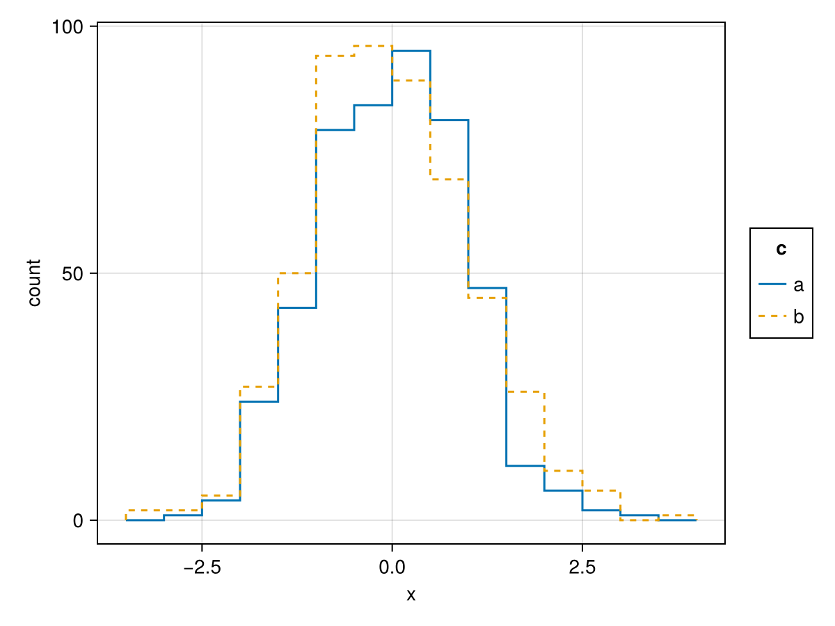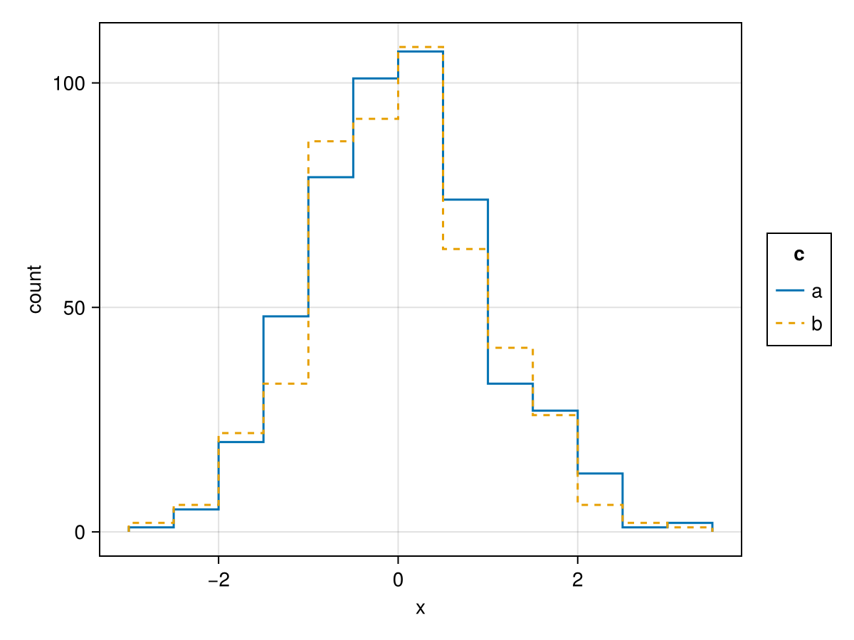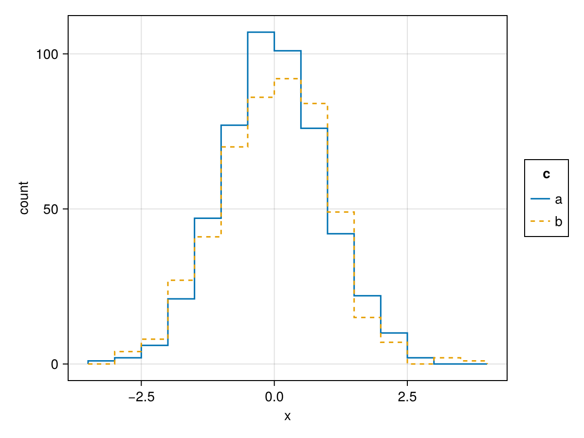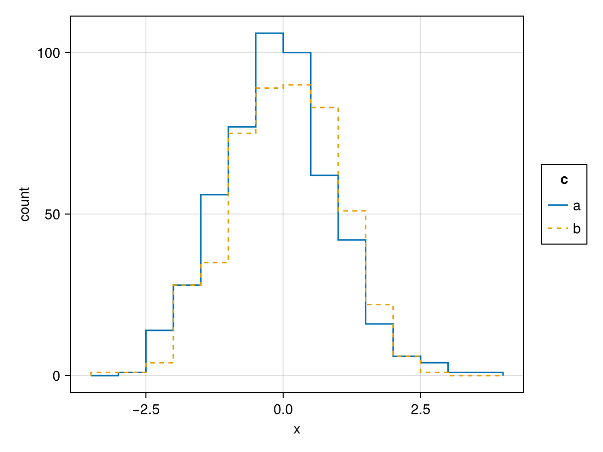 plt = data(df) * mapping(:x, color=:c, linestyle=:c) * histogram(Stairs; bins=20)
