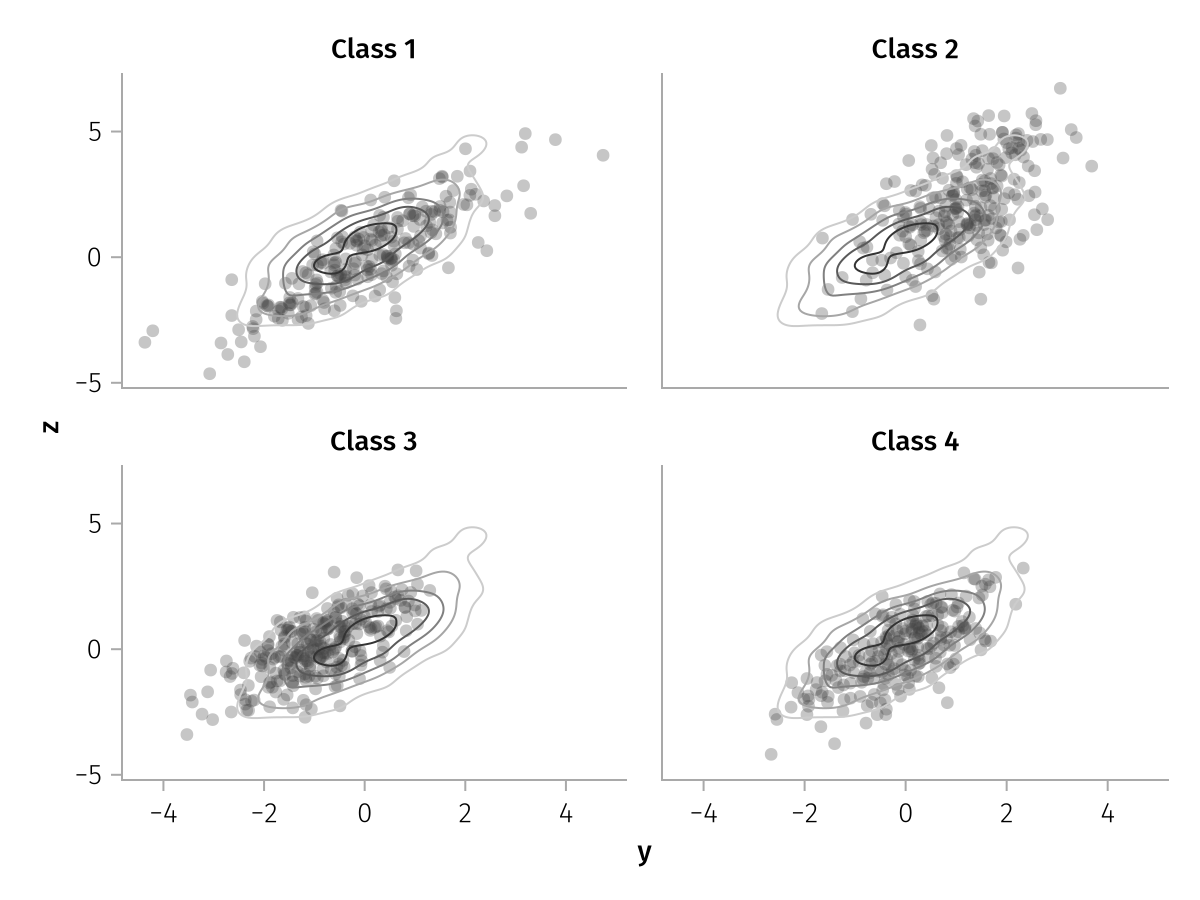 Naturally, the axes should represent the same variables (:y and :z) for both layers. Only the density layer should be a contour plot, whereas only the scatter layer should have some transparency and be grouped (according to :x) in different subplots.