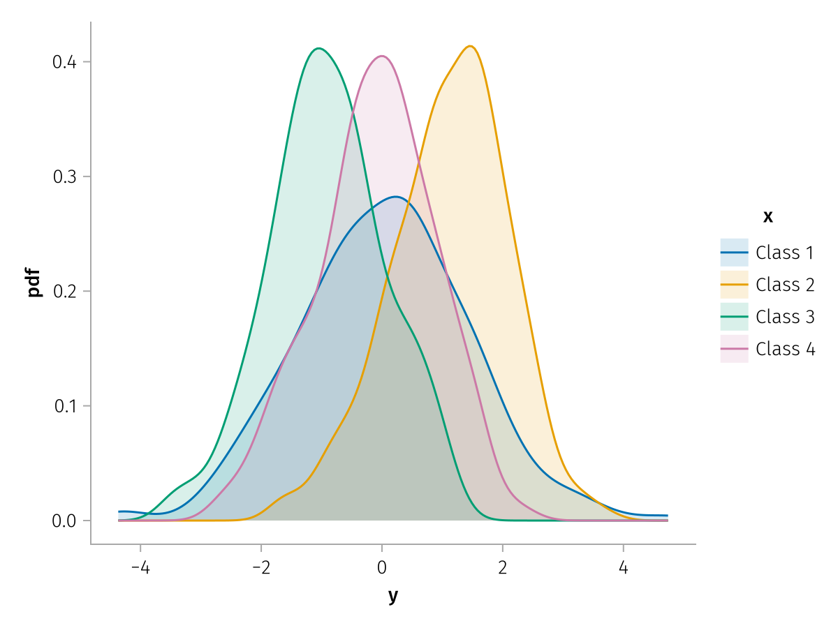 We achieve this goal using the distributive properties of addition and multiplication. This is best explained by example. Let us assume that we wish to visually inspect whether a discrete variable :x affects the joint distribution of two continuous variables, :y and :z.