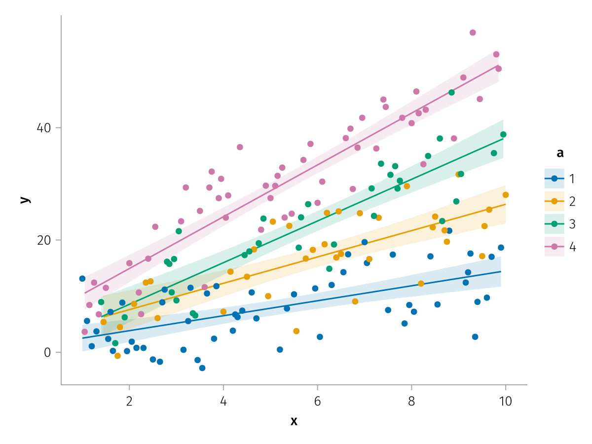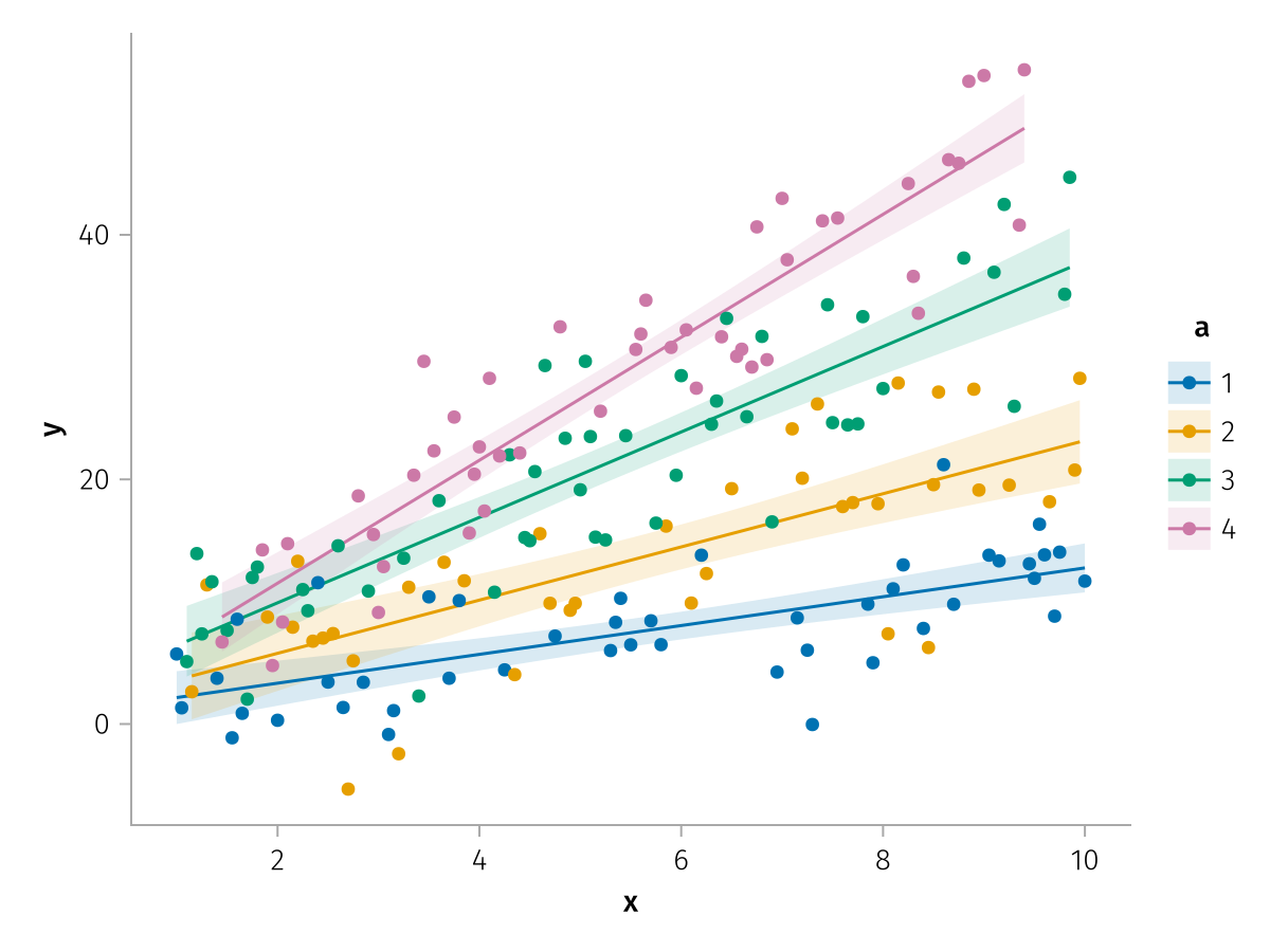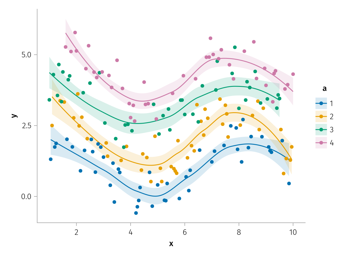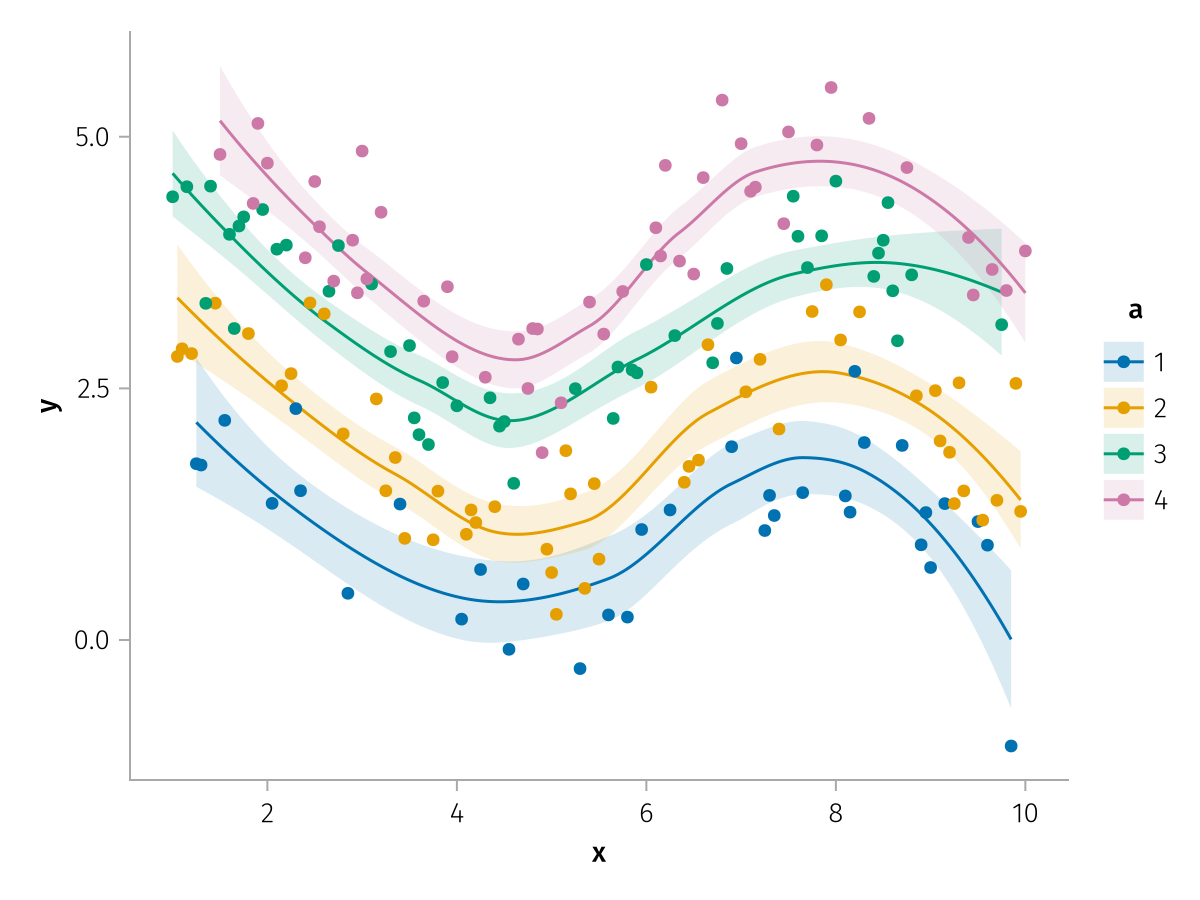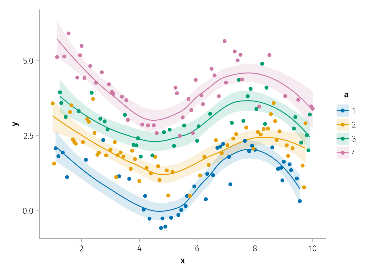 specs = data(df) * mapping(:x, :y, color=:a => nonnumeric) * (smooth() + visual(Scatter))