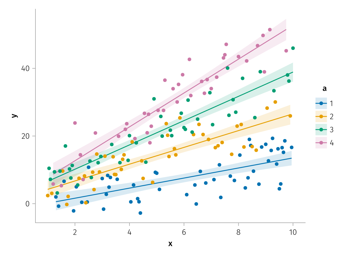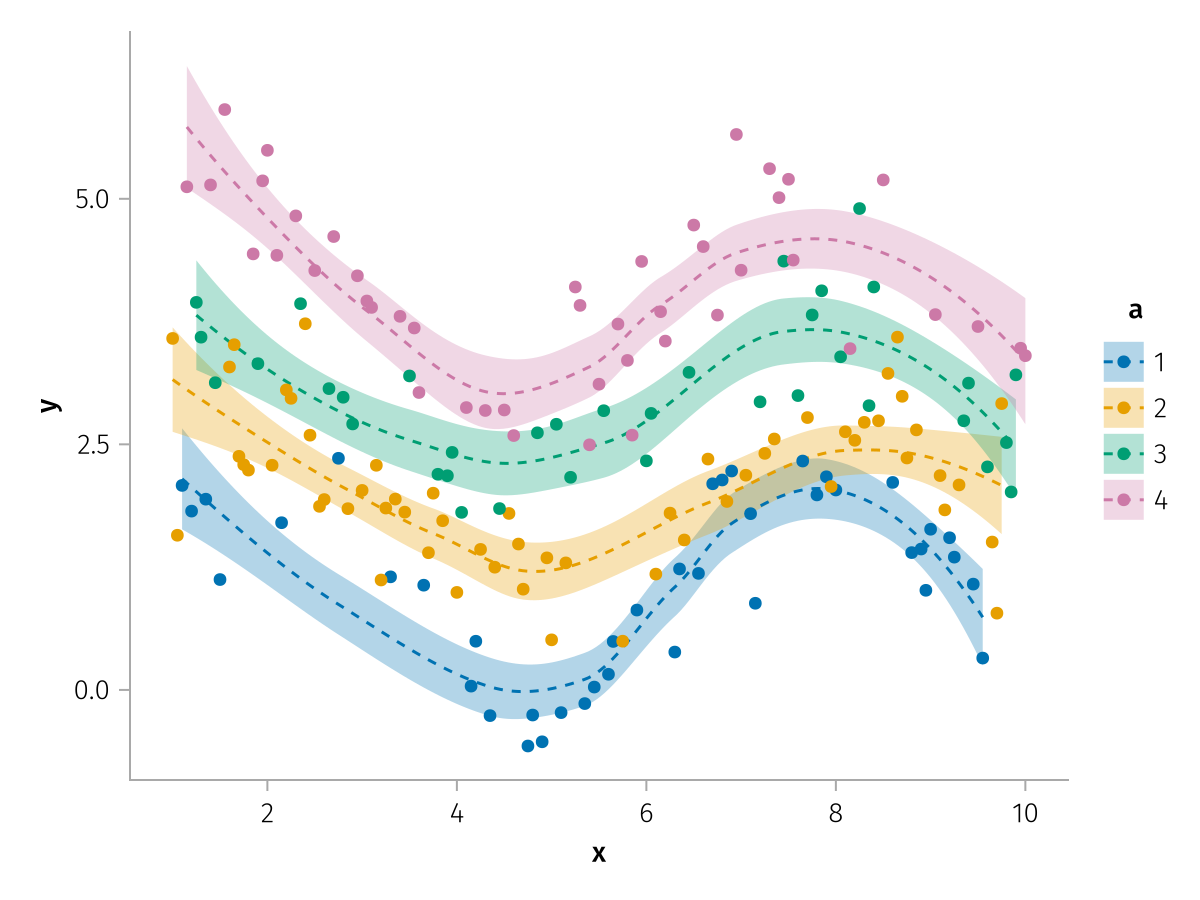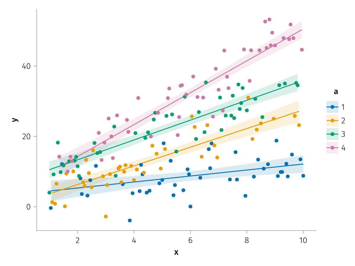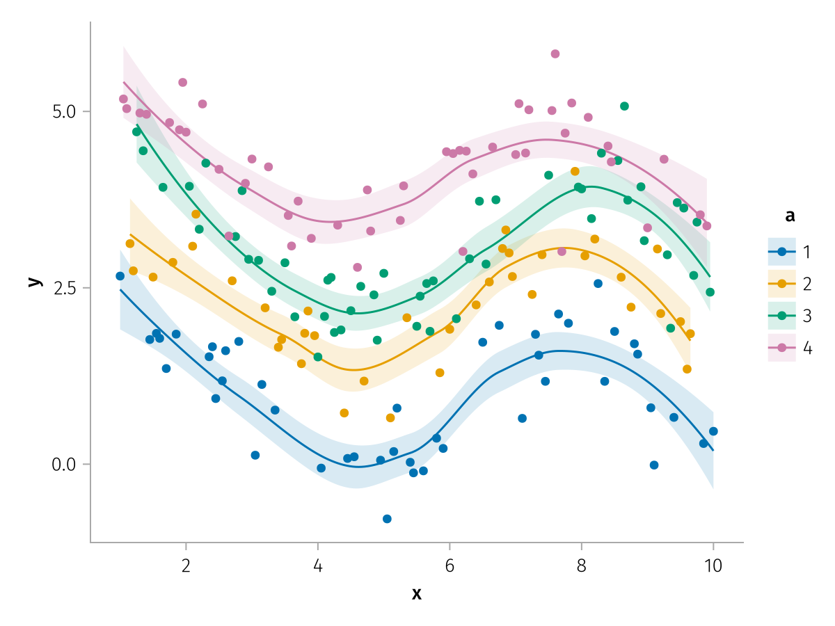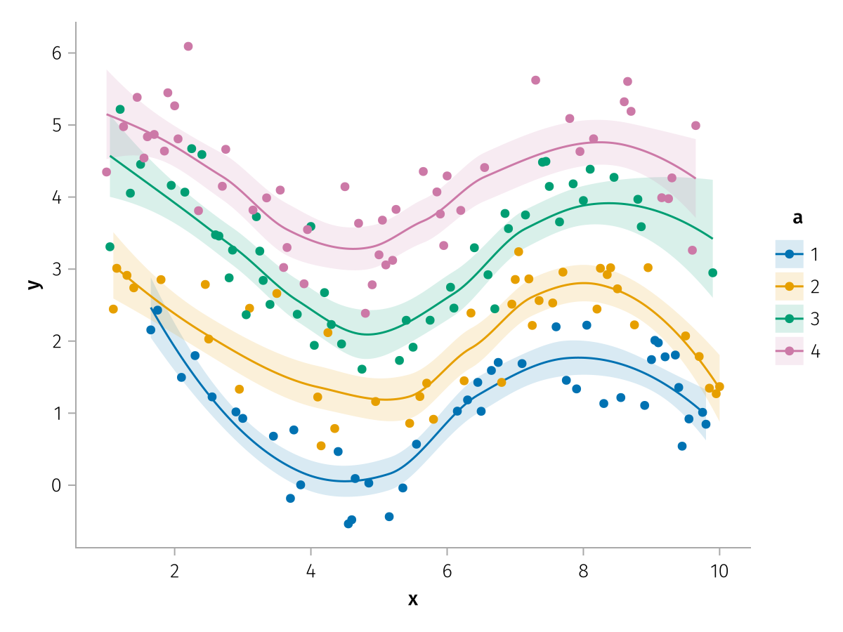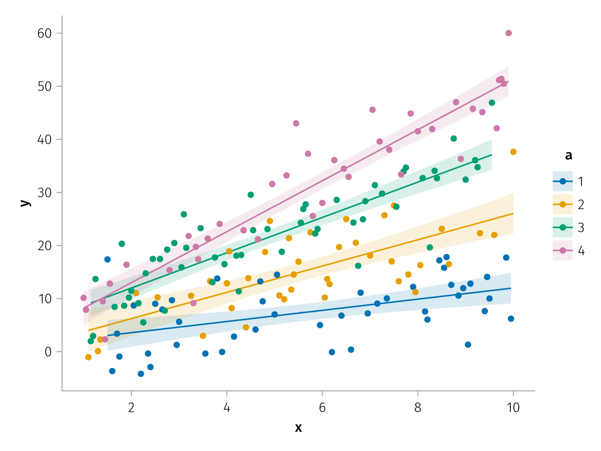 specs = data(df) * mapping(:x, :y, color=:a => nonnumeric) * (smooth() + visual(Scatter))