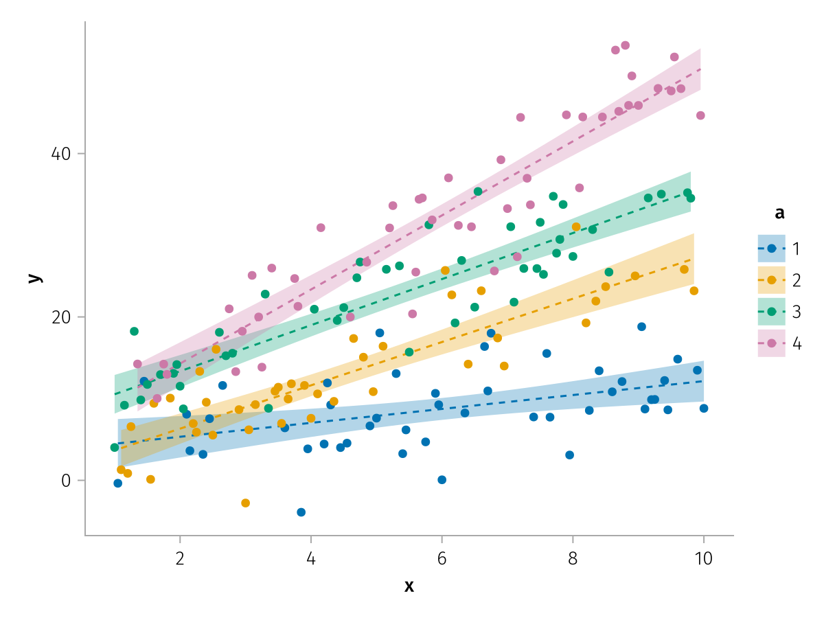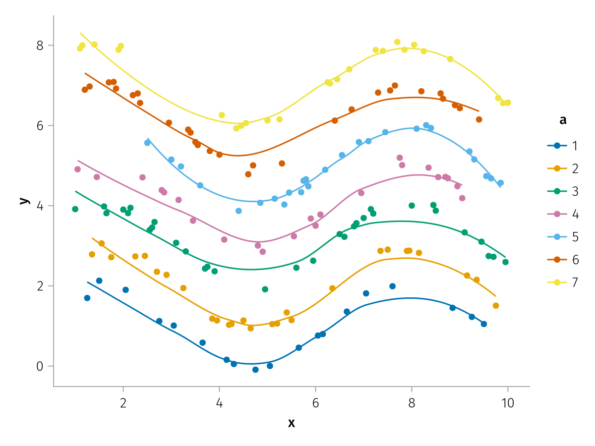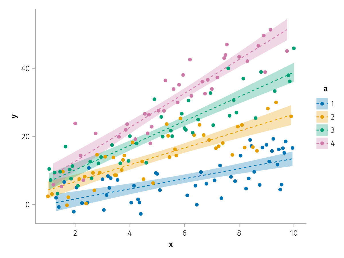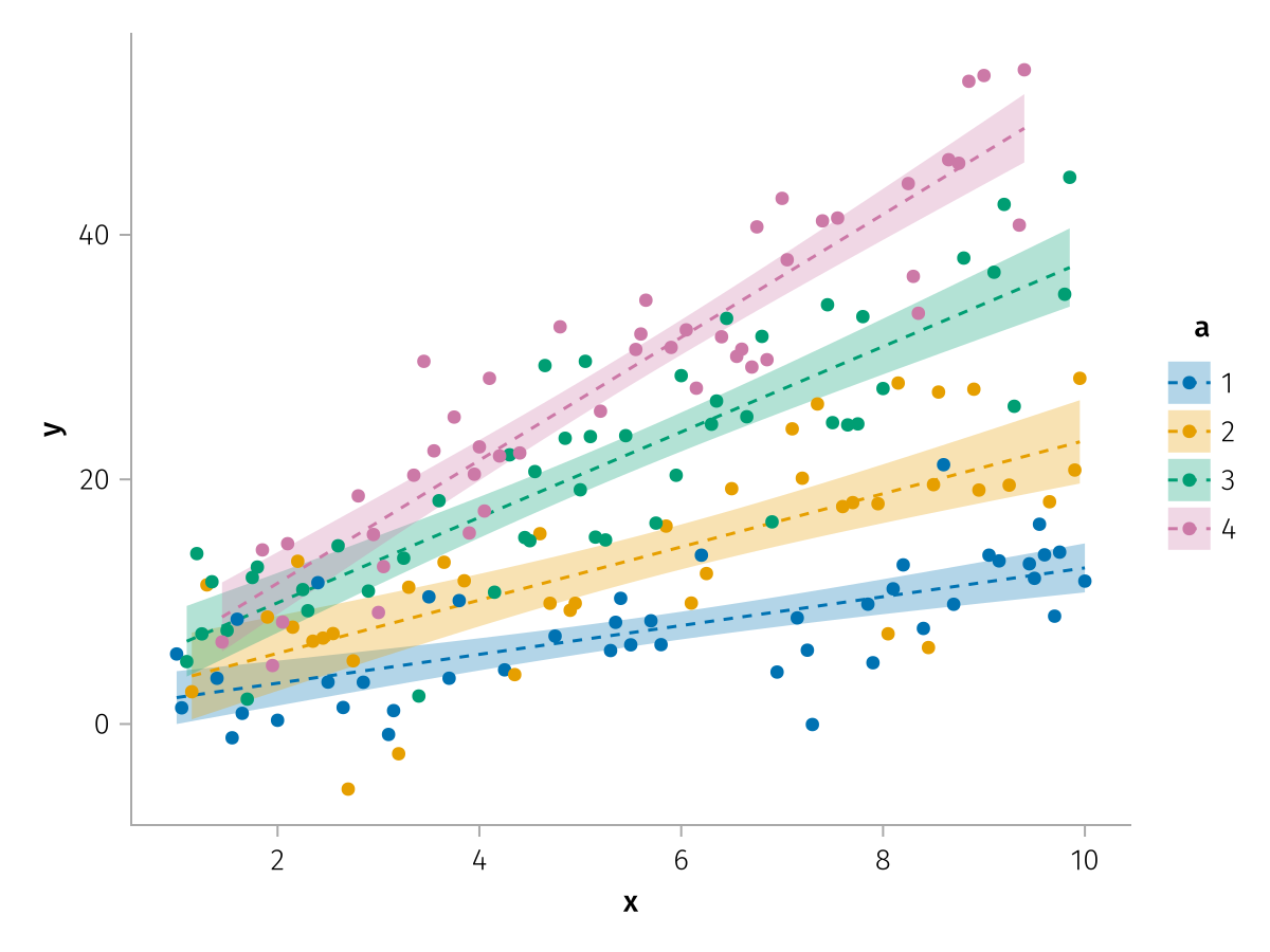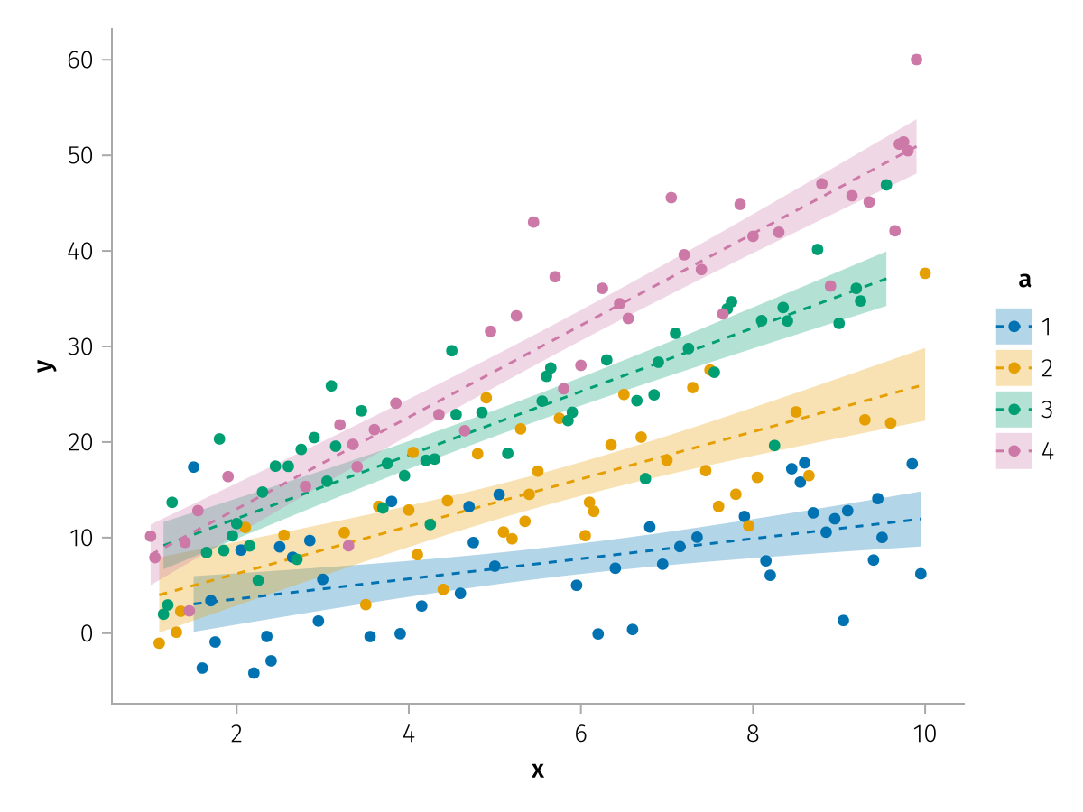 specs = data(df) * mapping(:x, :y, color=:a => nonnumeric) * (smooth() + visual(Scatter))