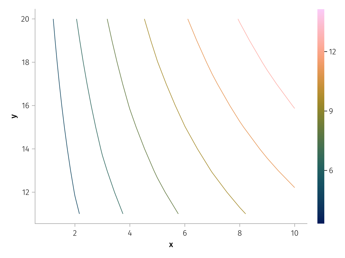 contours(; levels=5, kwargs...)Create contour lines over the grid spanned over x and y by args 1 and 2 in the mapping, with height values z passed via arg 3.