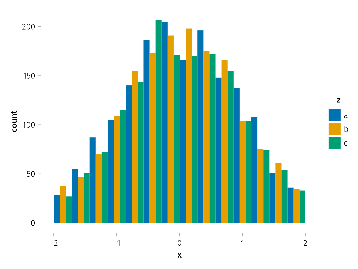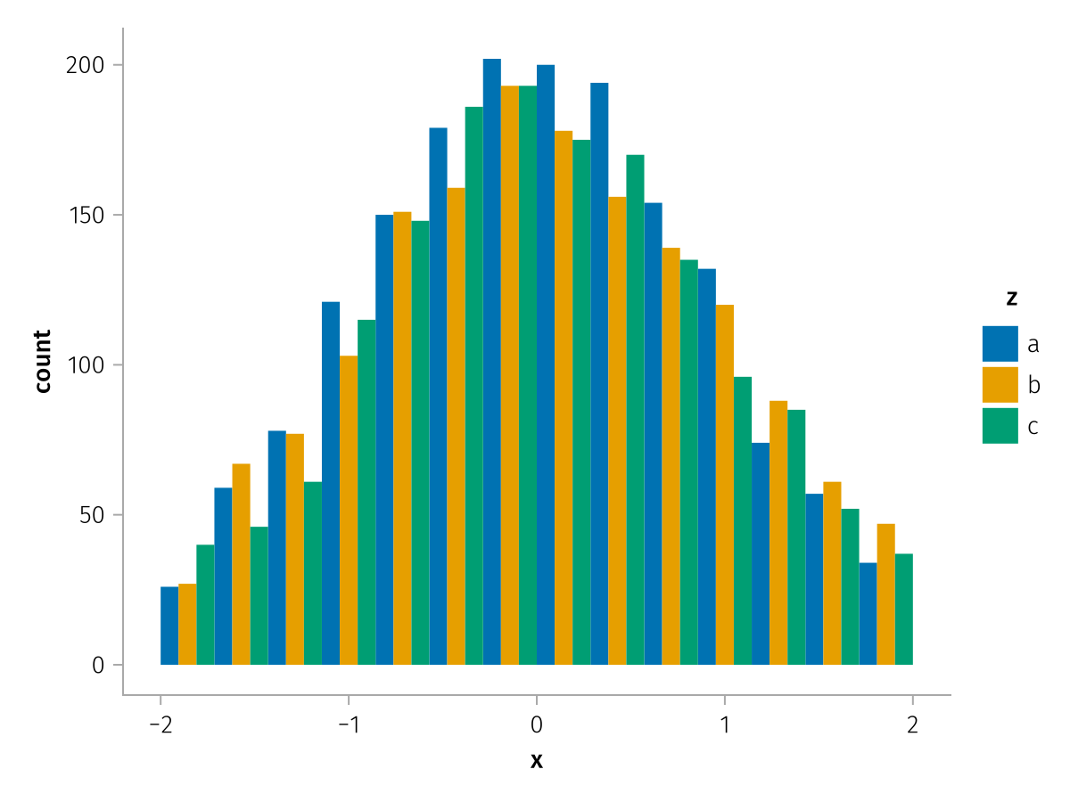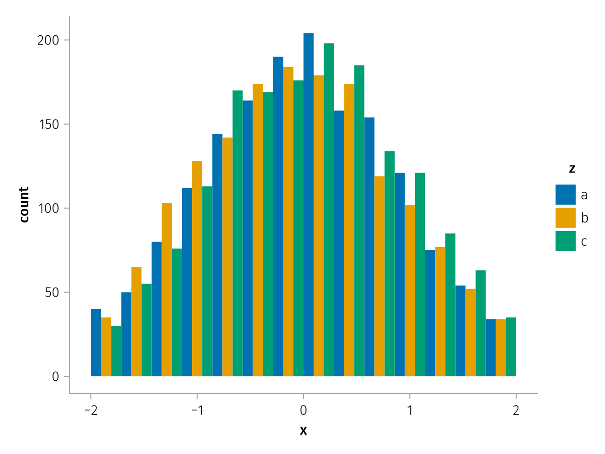 specs = data(df) * mapping(:x, dodge=:z, color=:z) * histogram(bins=range(-2, 2, length=15))