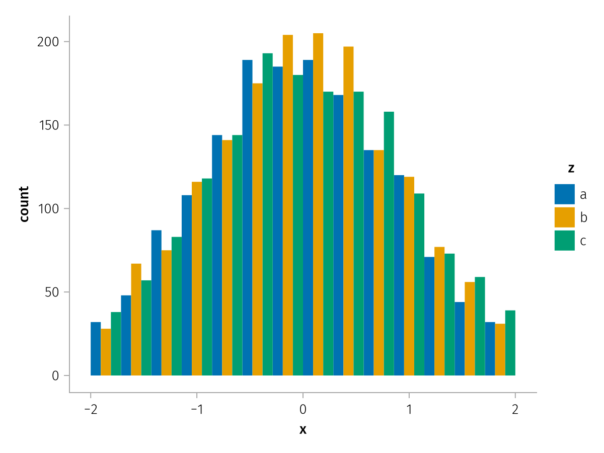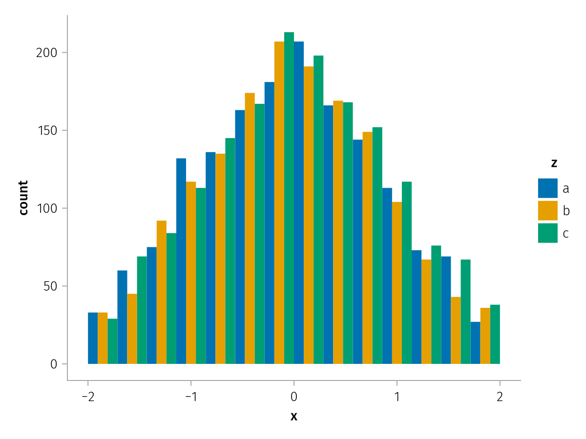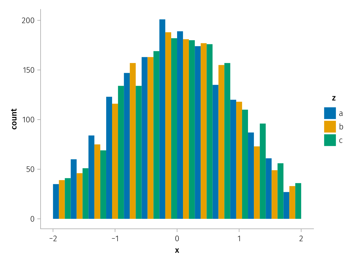 specs = data(df) * mapping(:x, dodge=:z, color=:z) * histogram(bins=range(-2, 2, length=15))