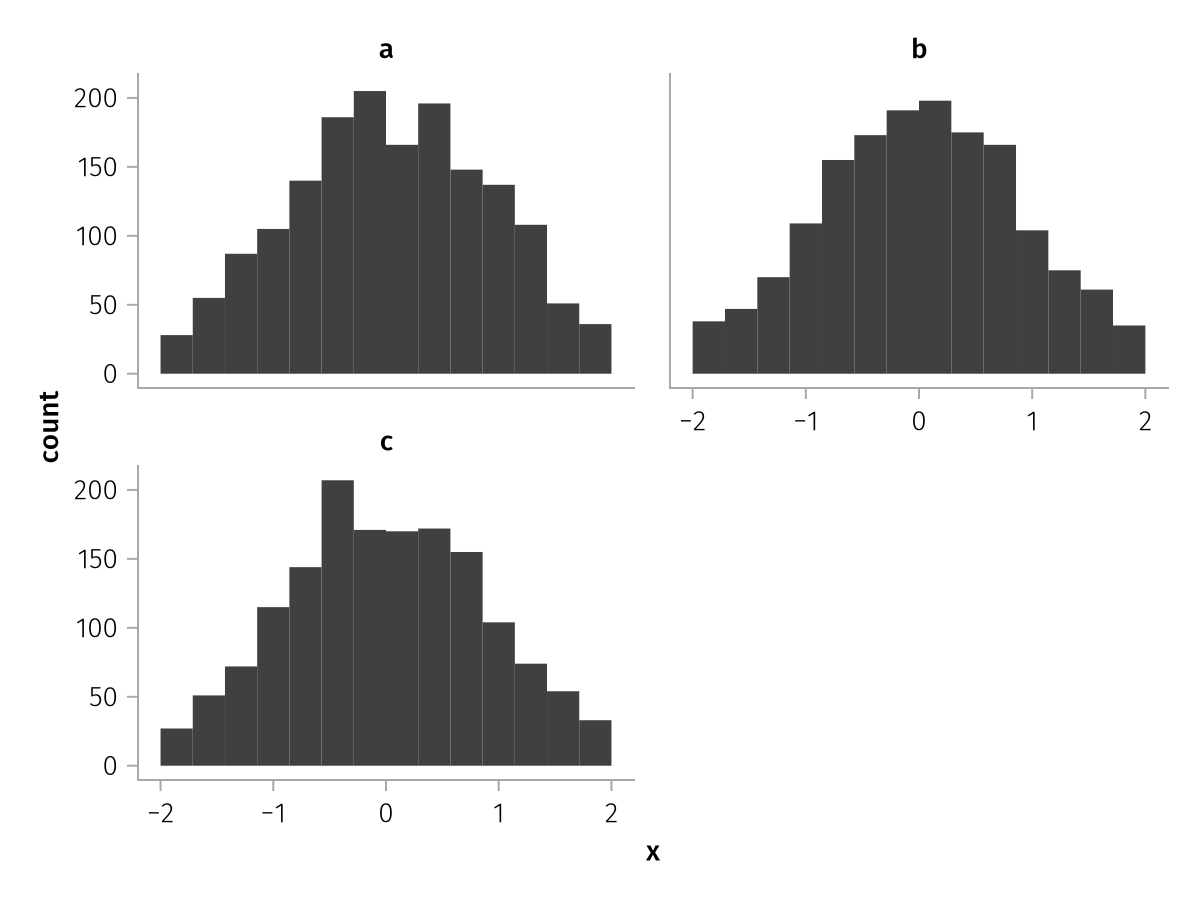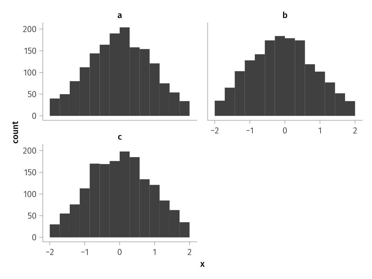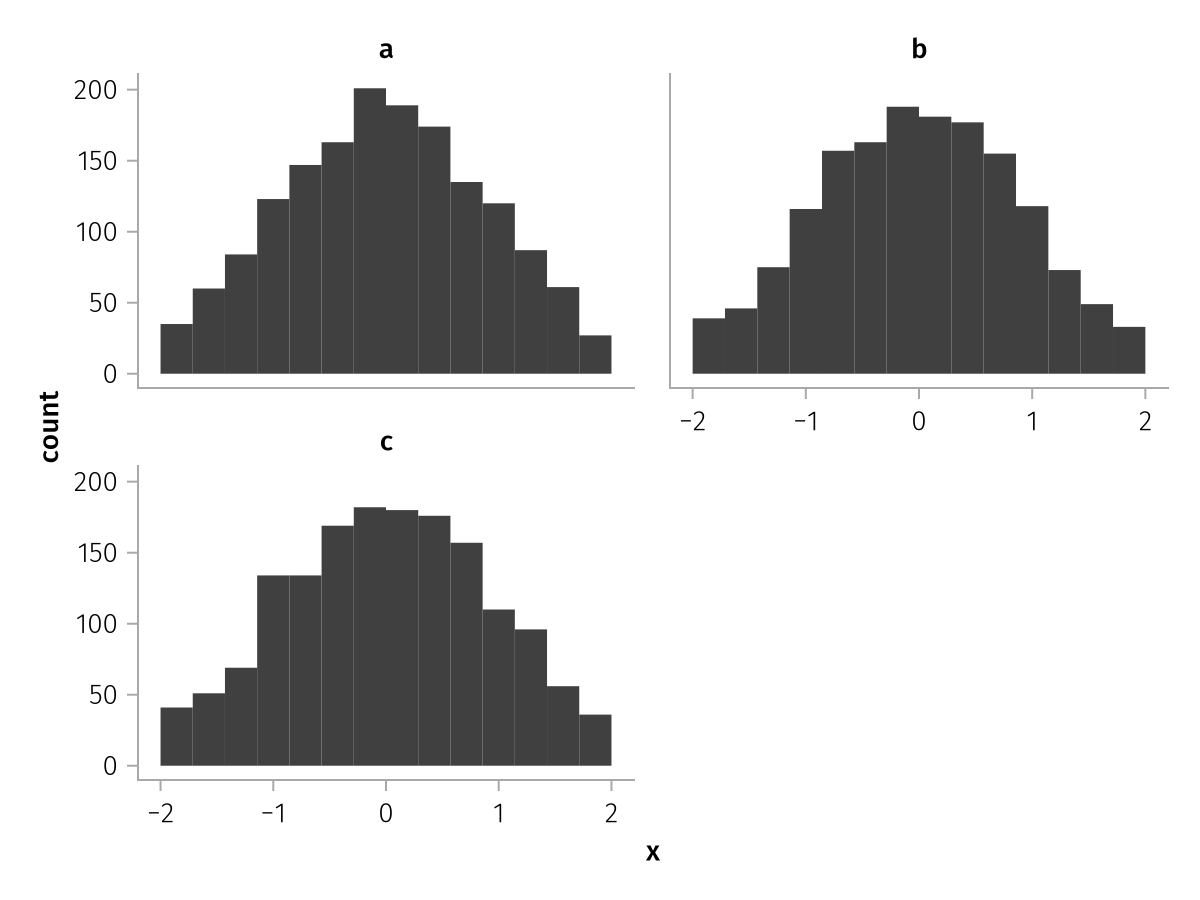 specs = data(df) * mapping(:x, layout=:z) * histogram(bins=range(-2, 2, length=15))