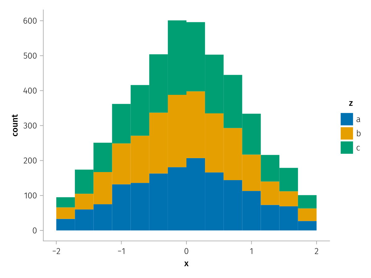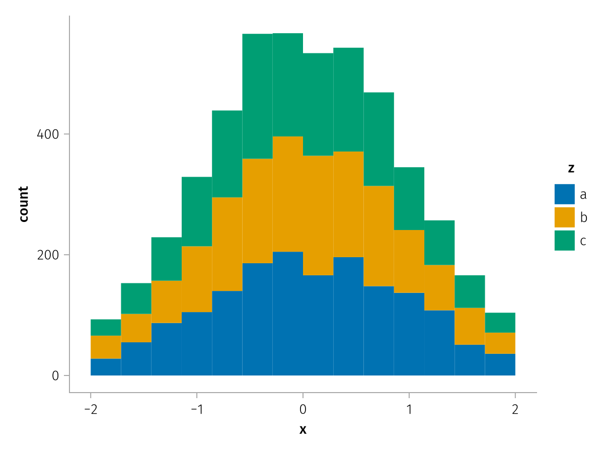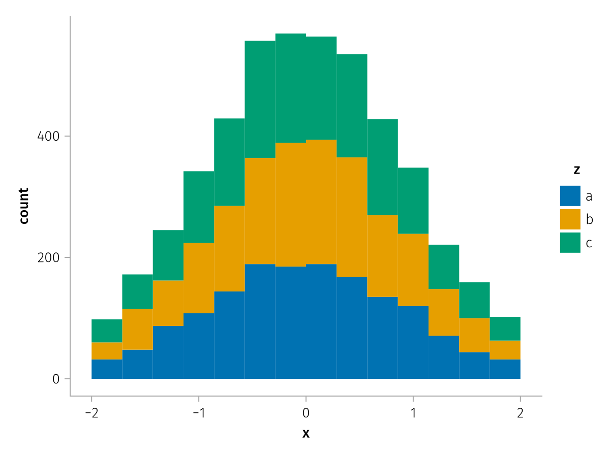 specs = data(df) * mapping(:x, stack=:z, color=:z) * histogram(bins=range(-2, 2, length=15))