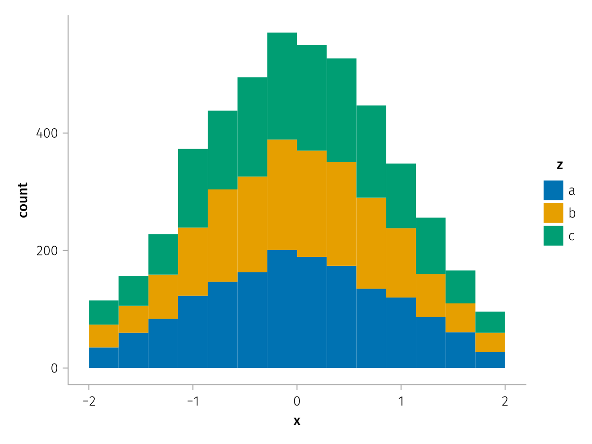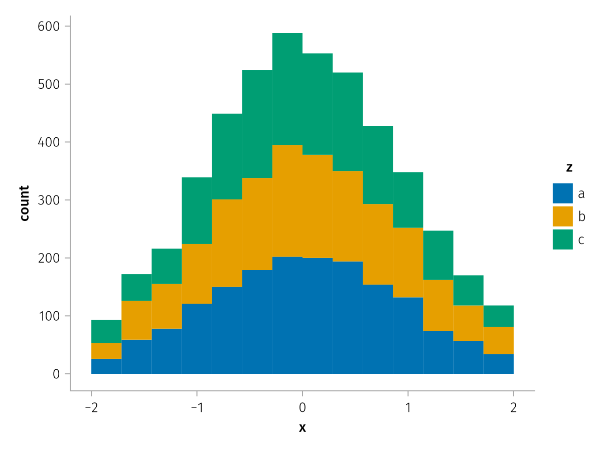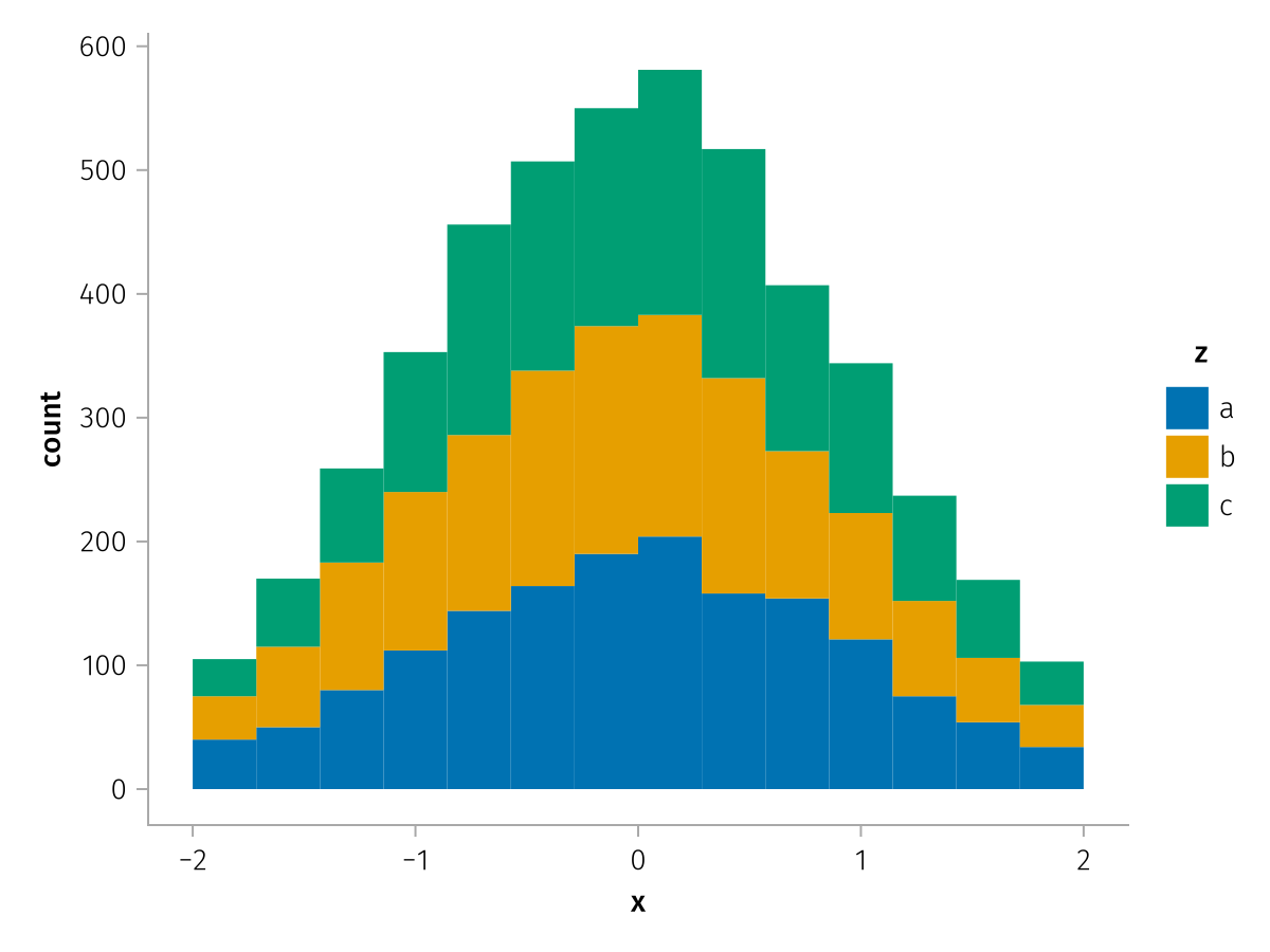 specs = data(df) * mapping(:x, stack=:z, color=:z) * histogram(bins=range(-2, 2, length=15))