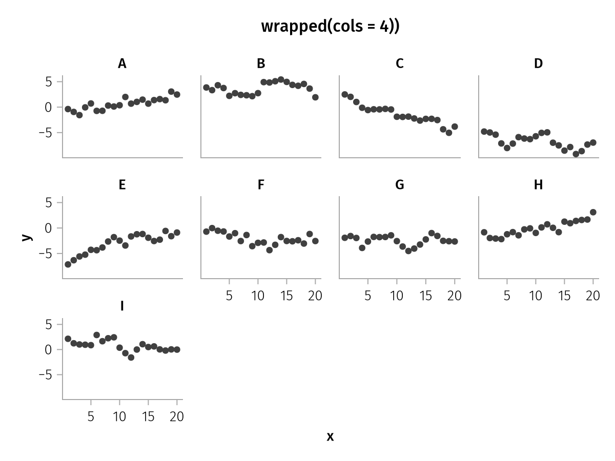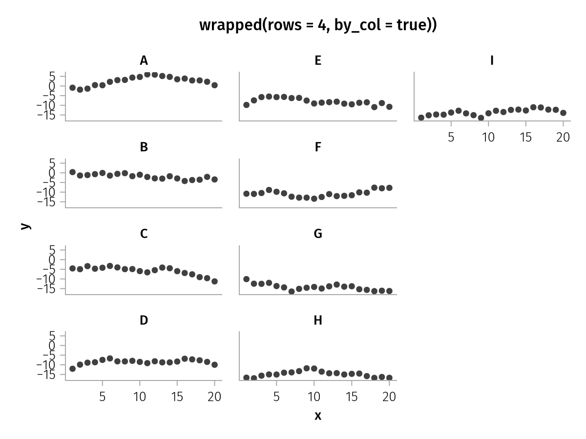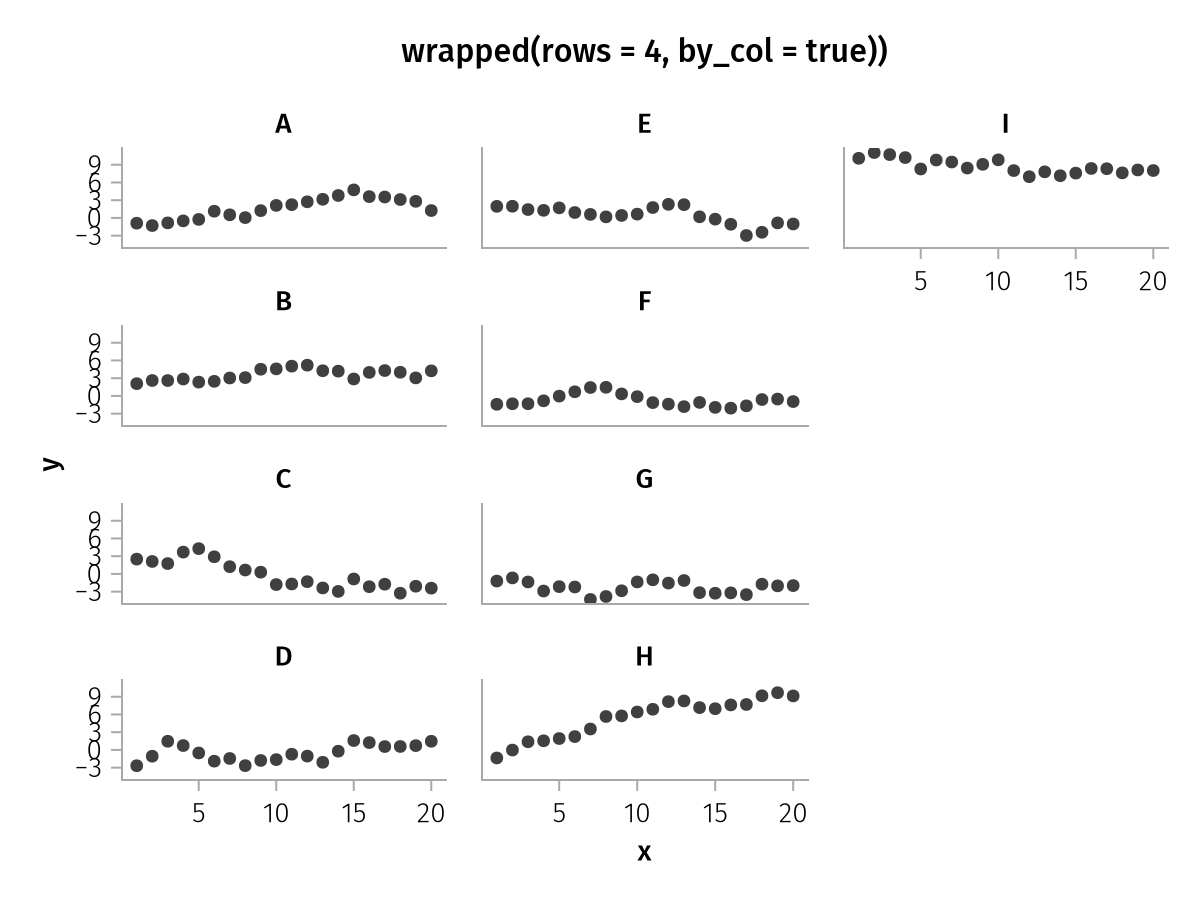 Normally, with the Layout aesthetic, rows wrap automatically such that an approximately square distribution of facets is attained. The wrapped function is a convenient helper to control the shape of the layout. You can control the maximum rows or columns, and the direction in which the layout is filled, which is row-by-row by default.