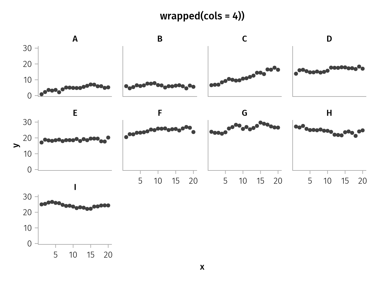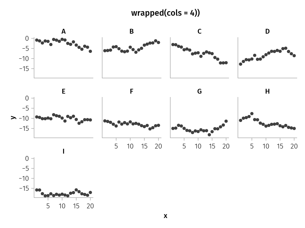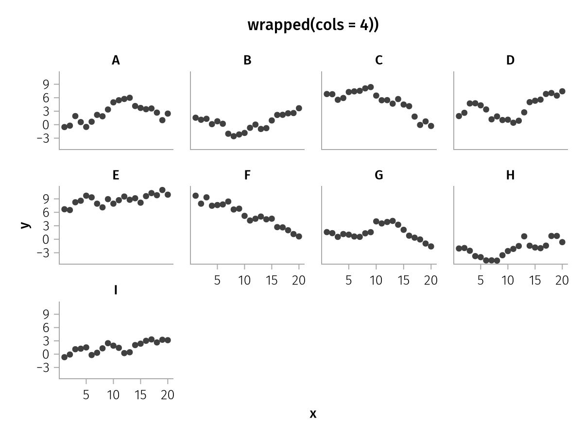 Normally, with the Layout aesthetic, rows wrap automatically such that an approximately square distribution of facets is attained. The wrapped function is a convenient helper to control the shape of the layout. You can control the maximum rows or columns, and the direction in which the layout is filled, which is row-by-row by default.