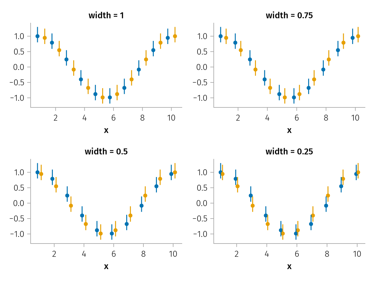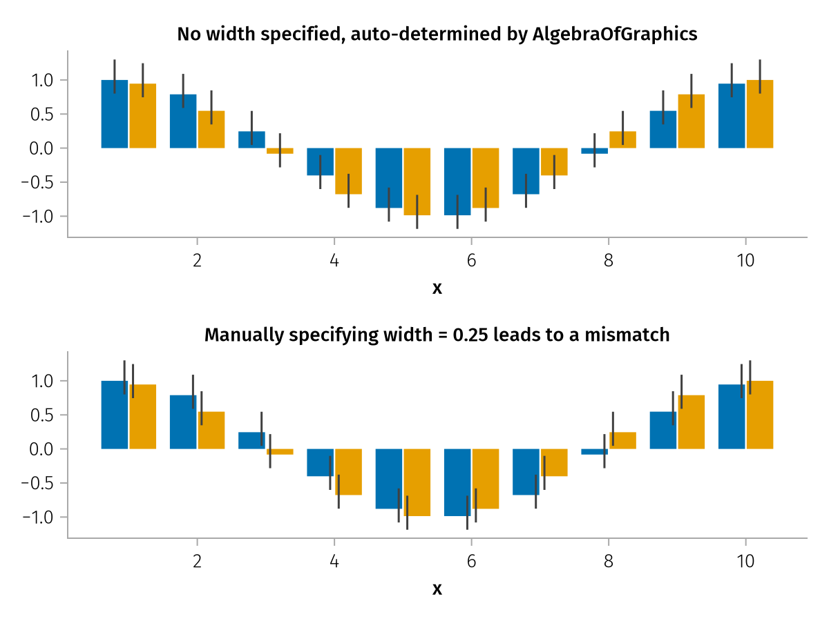 A common scenario is plotting errorbars on top of barplots. In this case, AlgebraOfGraphics can detect the inherent dodging width of the barplots and adjust accordingly for the errorbars. Note in this example how choosing a manual dodging width only applies to the errorbars (because the barplot plot type handles this internally) and potentially leads to a misalignment between the different plot elements: