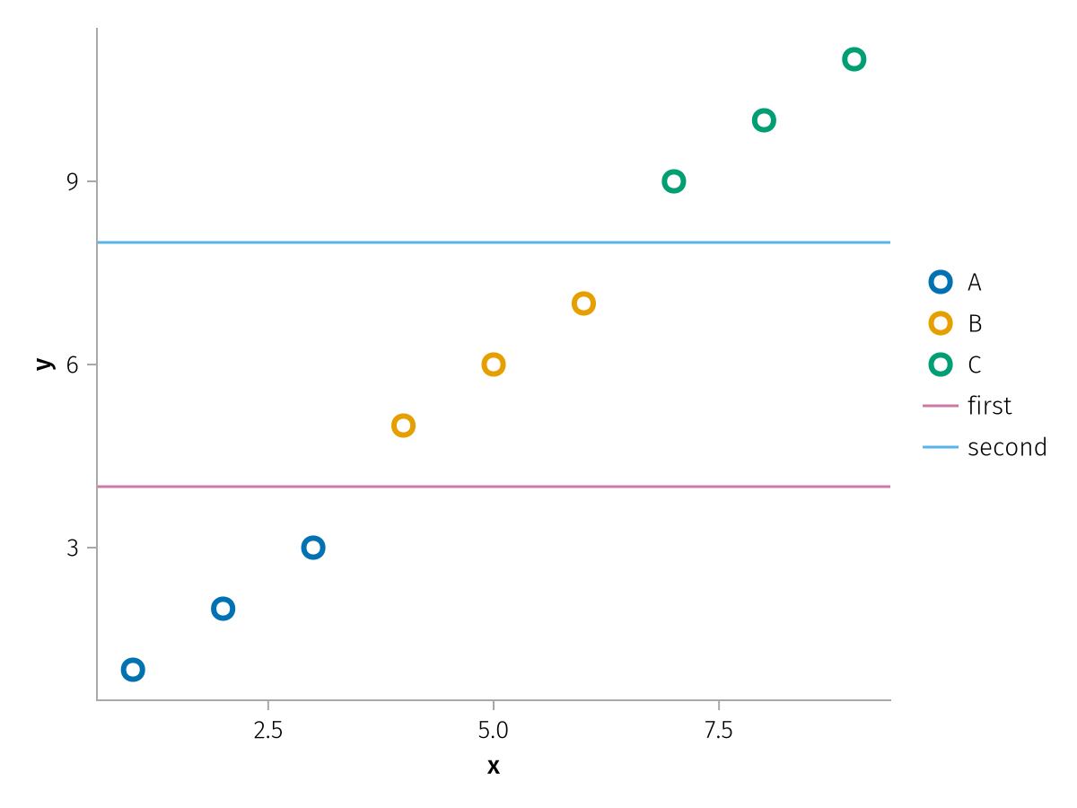 In the following example, both Scatter and HLines use the Color aesthetic, Scatter for the strokecolor keyword and HLines for color. A single merged legend is rendered for both, which does not have a title because it derives from two differently named columns.