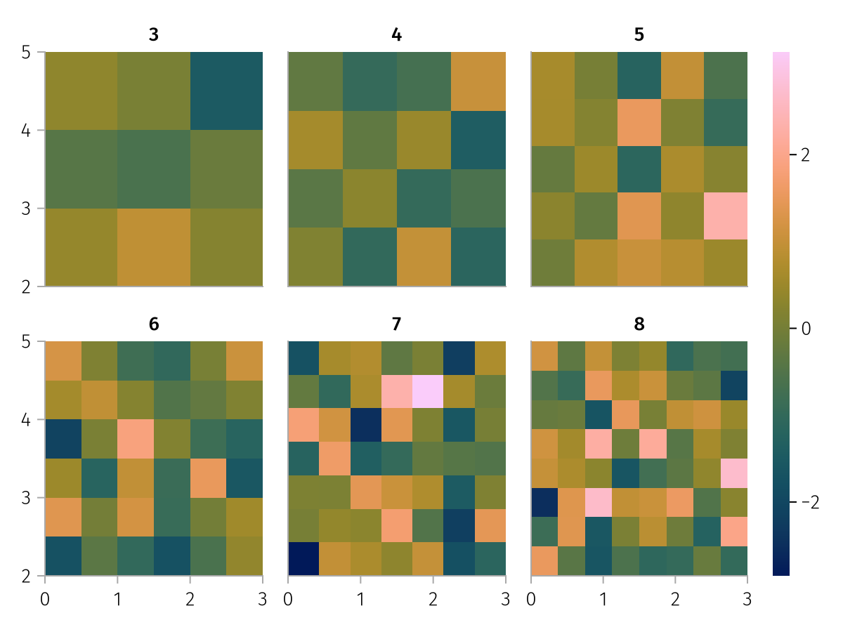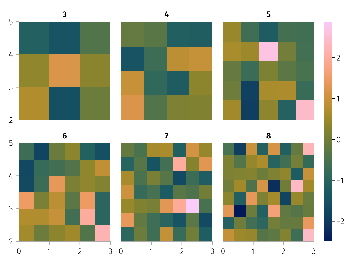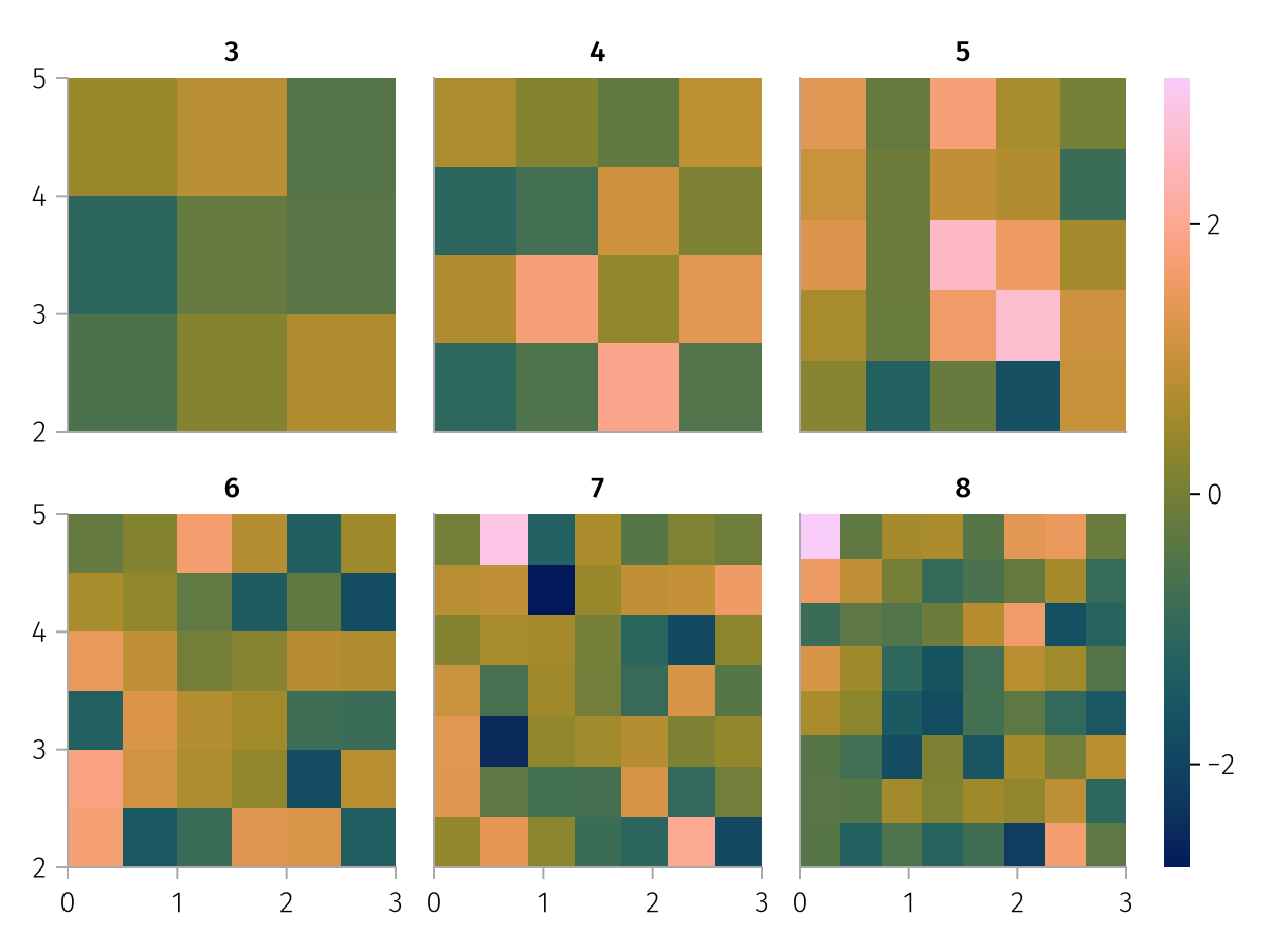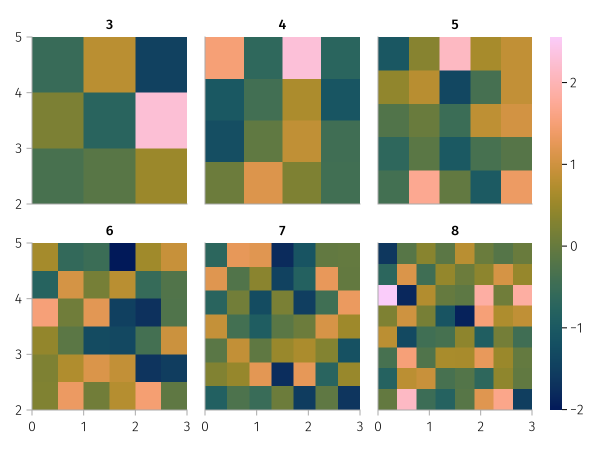 The order of seasons is correct in this version, however each y axis has its own label now (corresponding to the source columns) and all y axes are unlinked. That is because AlgebraOfGraphics has the ability to extract labels across multiple input dimensions and it will not merge axes that are labeled differently. The input shape in our case is (4,) which is equivalent to the size of our four-column vectors. So there are four labels.