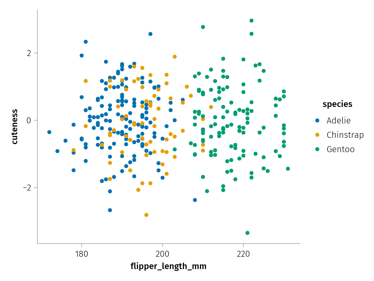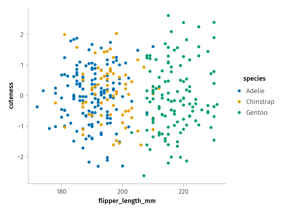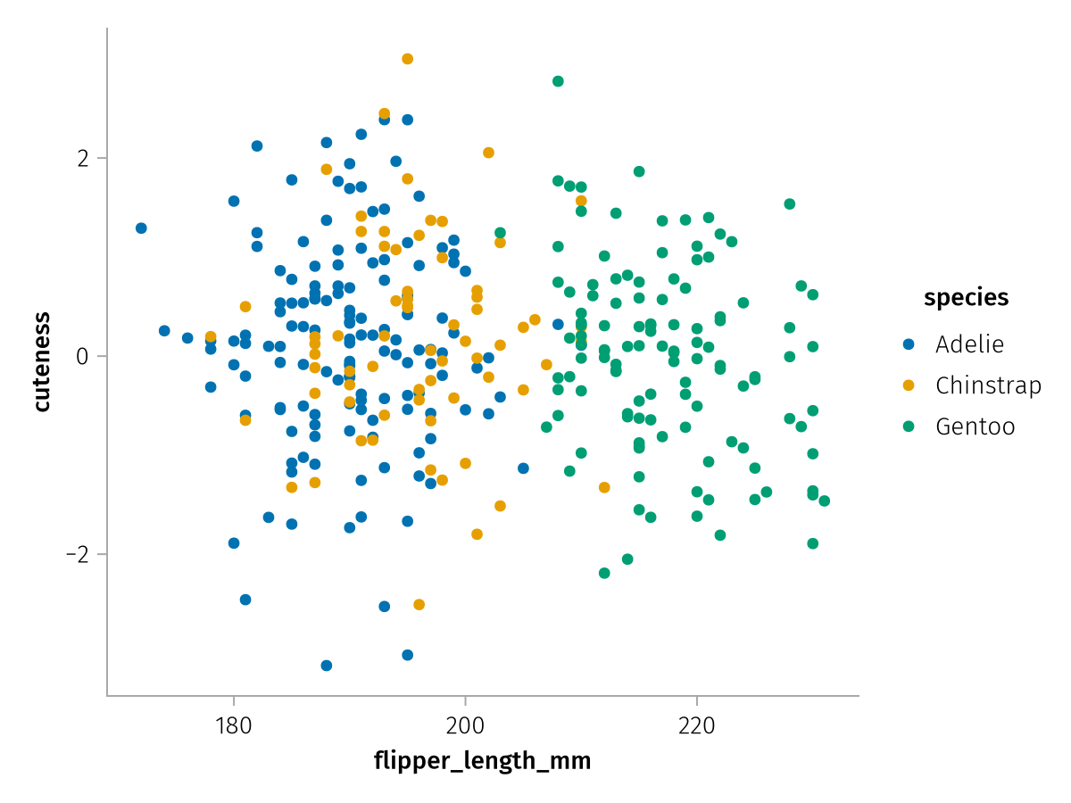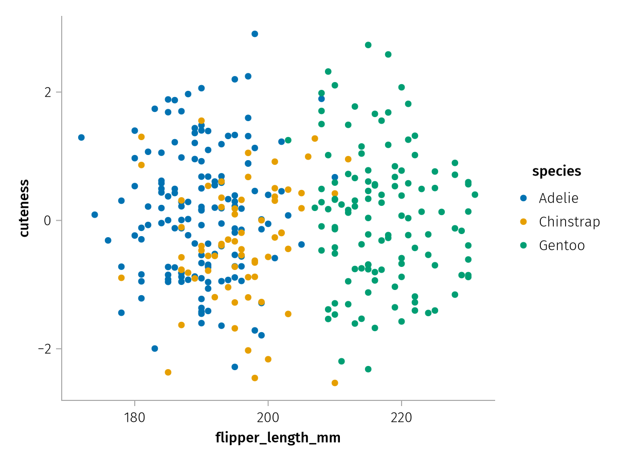 Let's pretend we have computed a "cuteness score" for our penguins using some classifier, which we now have in a vector. We can create a plot where we mix that data with the penguins dataframe without having to construct a new table: