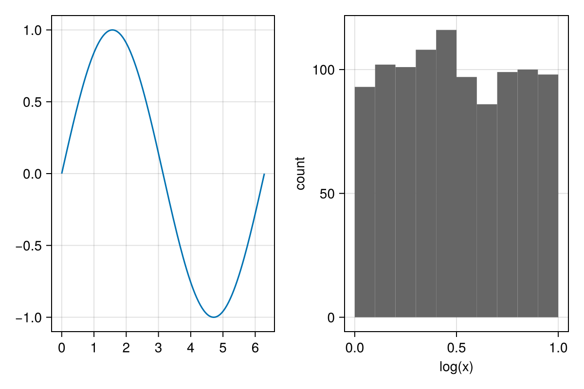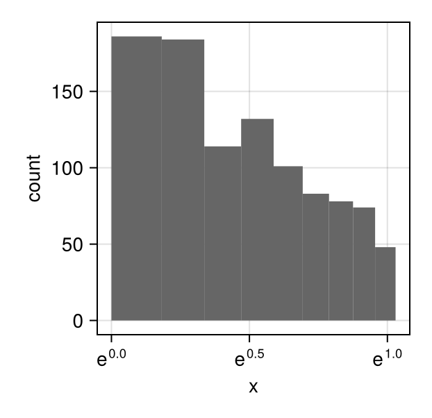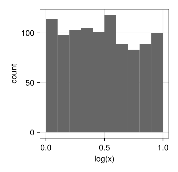 hist1 = data(df) * mapping(:x => log => "log(x)") * histogram()