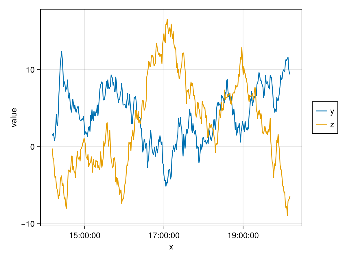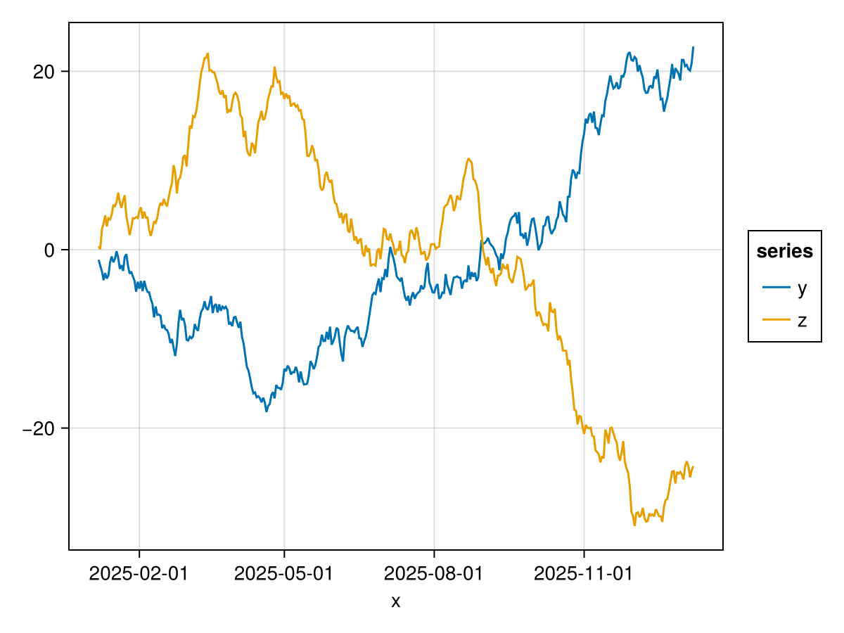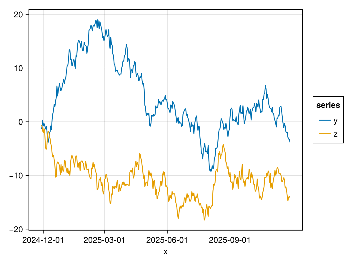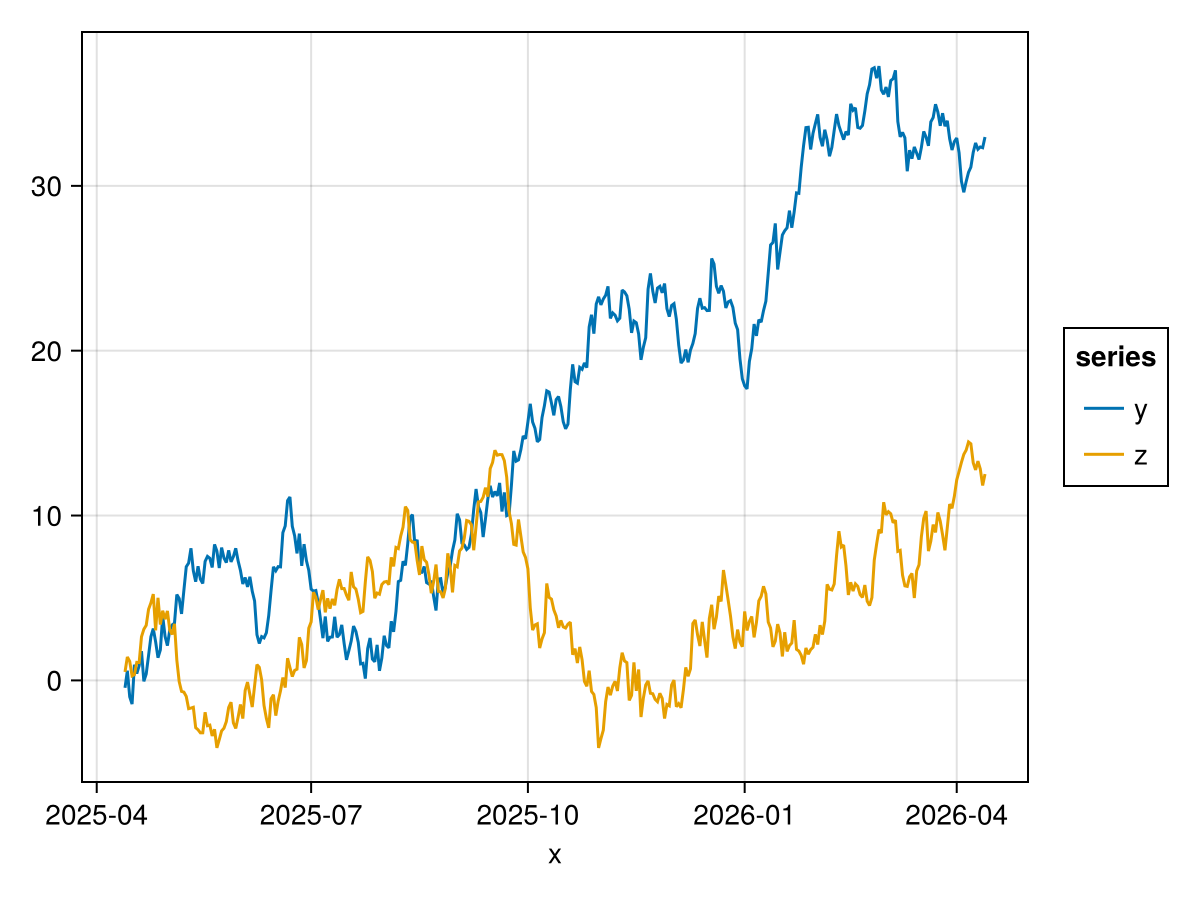mapping(:x, [:y, :z], color=dims(1) => "series") *