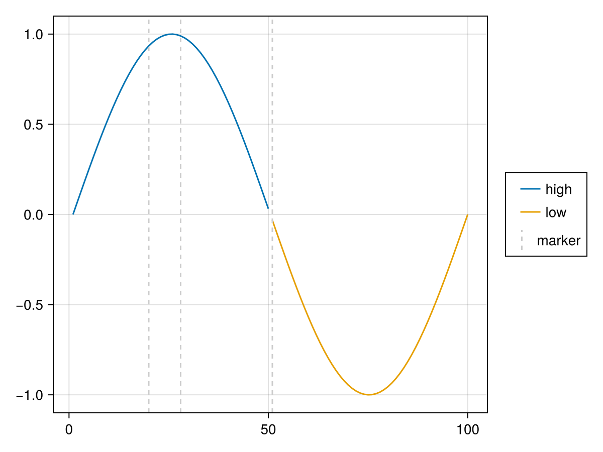 plt = mapping(x, y, color = repeat(["high", "low"], inner = 50)) *