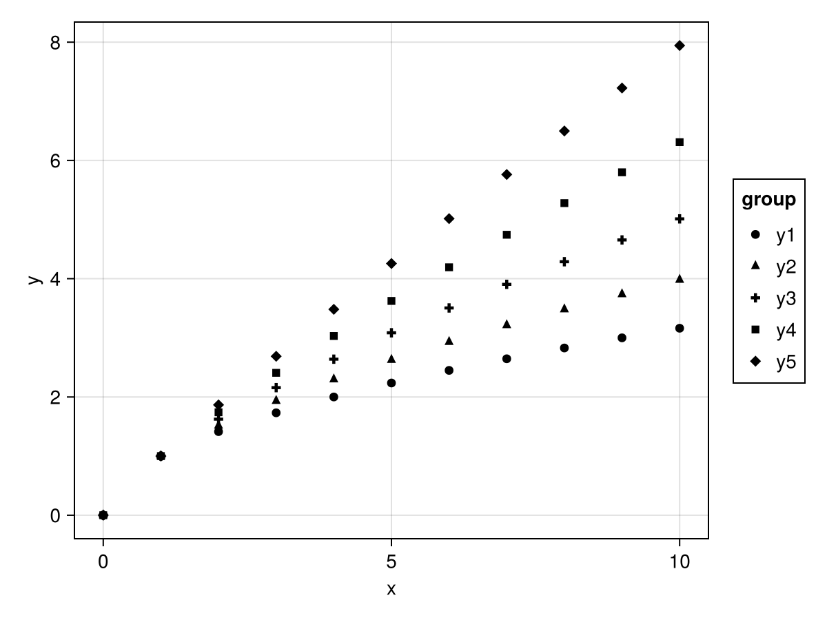 data(df_wide) * mapping(:x, ys, marker = dims(1)) * visual(Scatter) |> draw