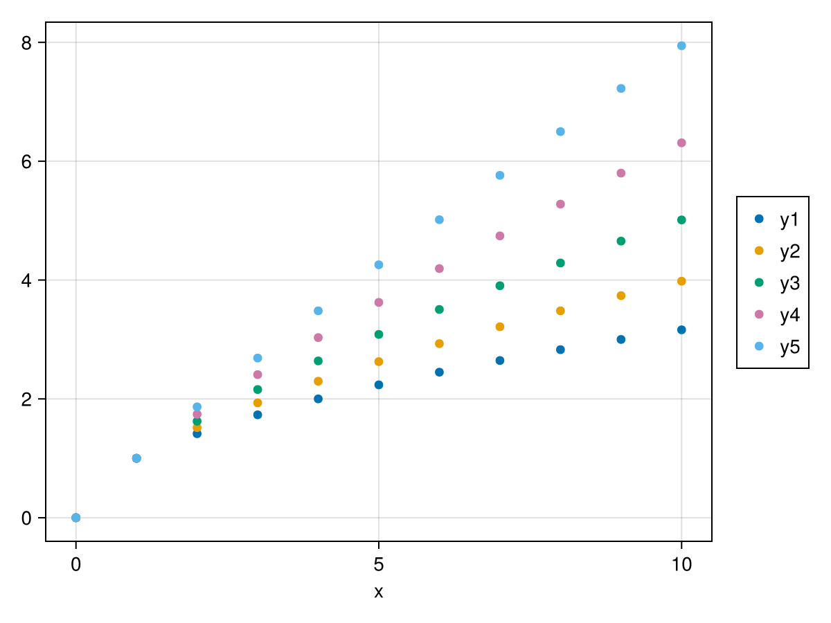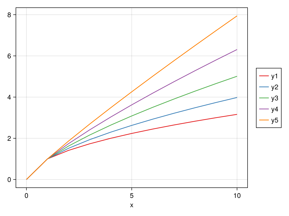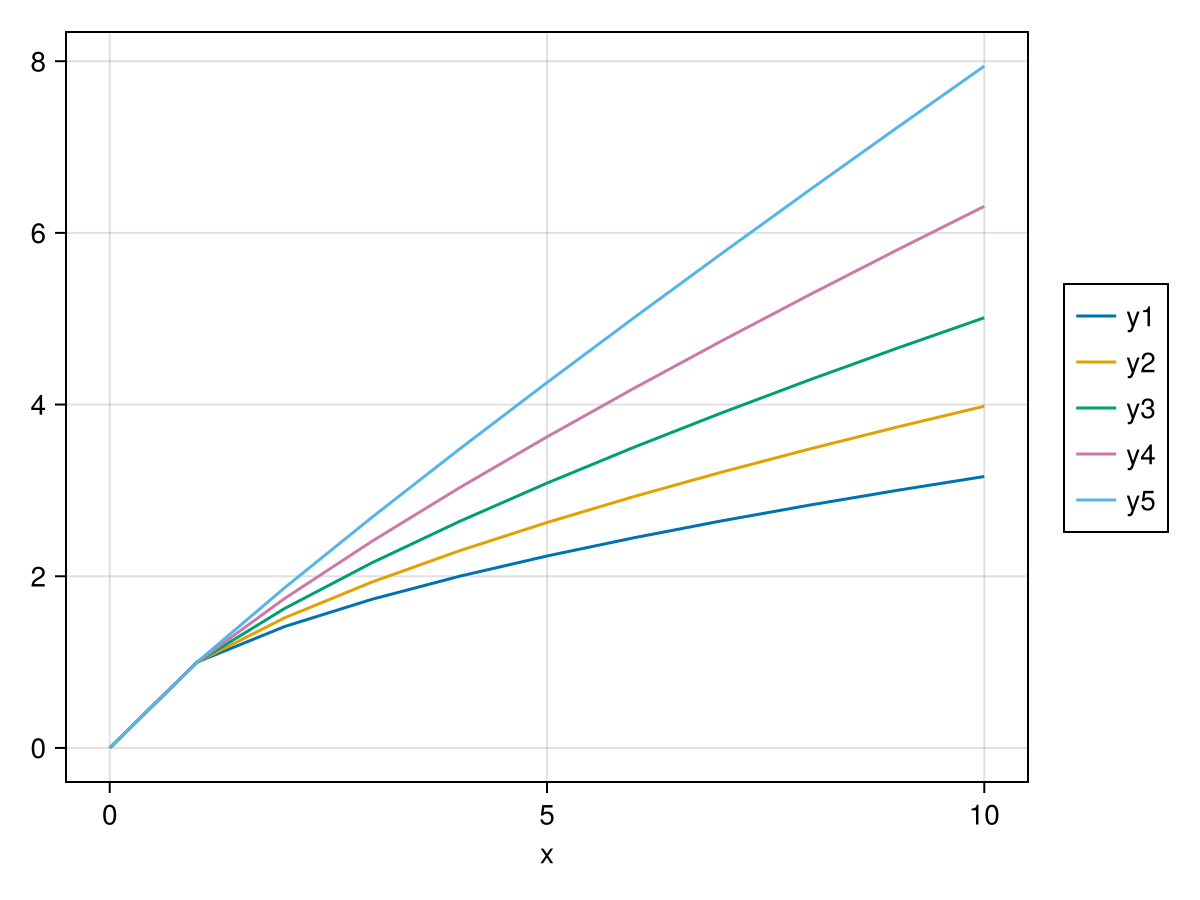 df_wide[!, "y$i"] = df_wide.x .^ (0.4 + i * 0.1)