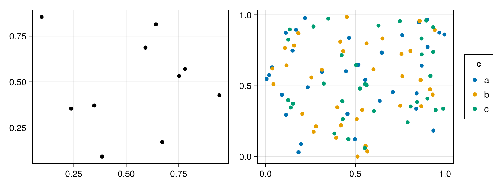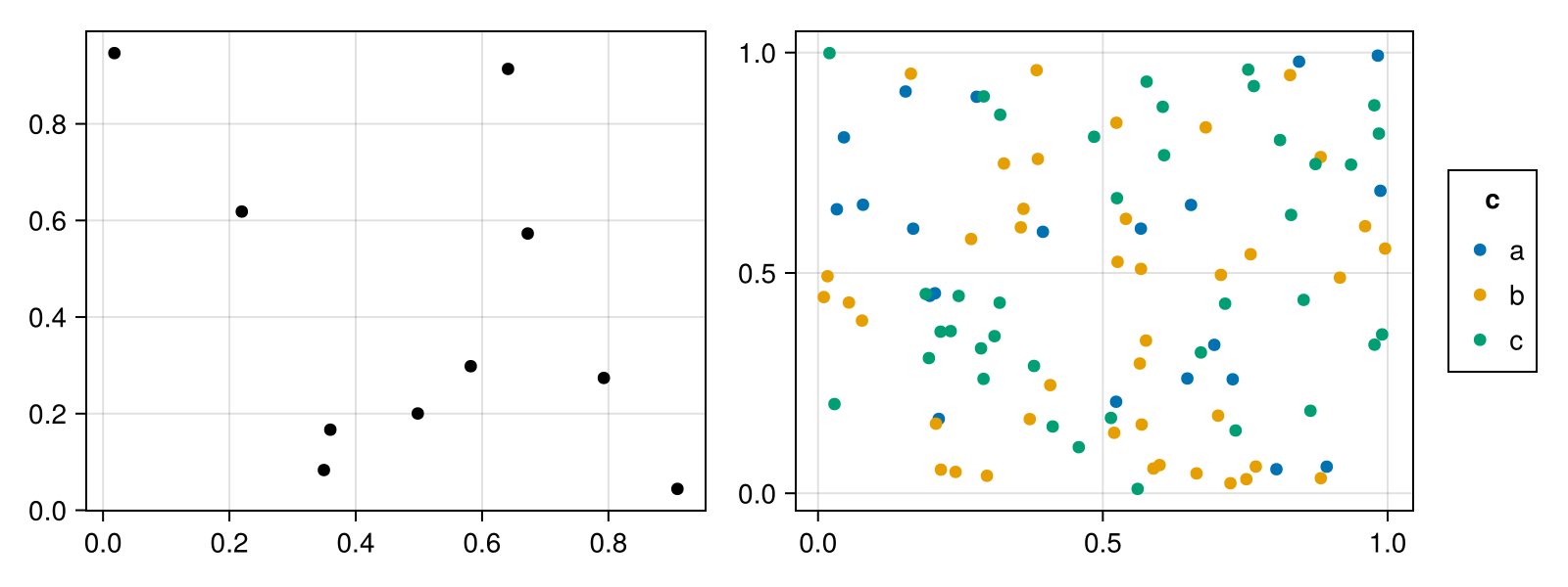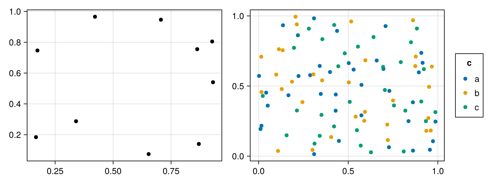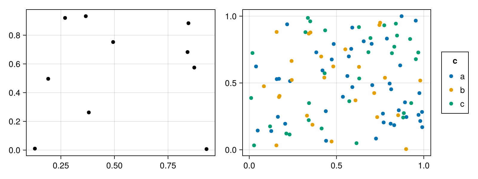 df = (x=rand(100), y=rand(100), c=rand(["a", "b", "c"], 100))