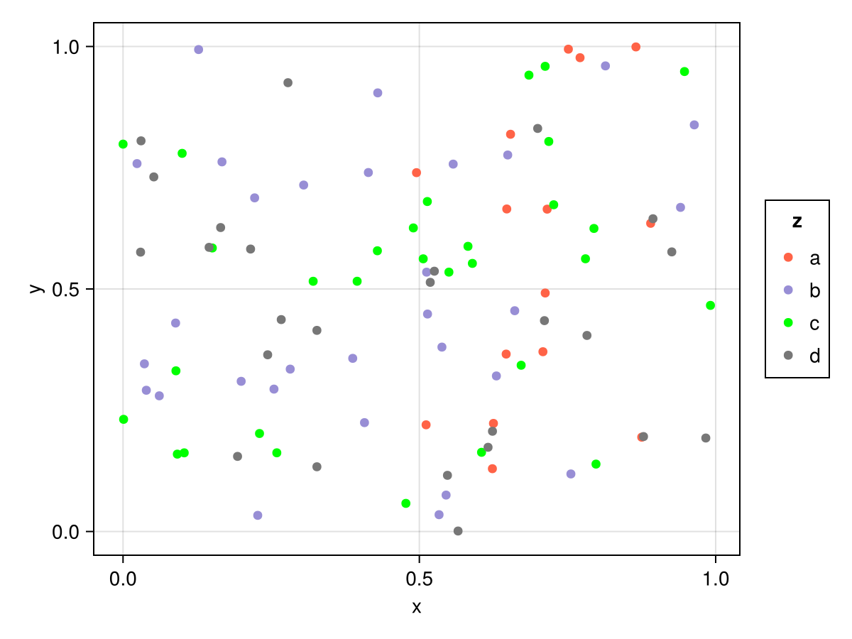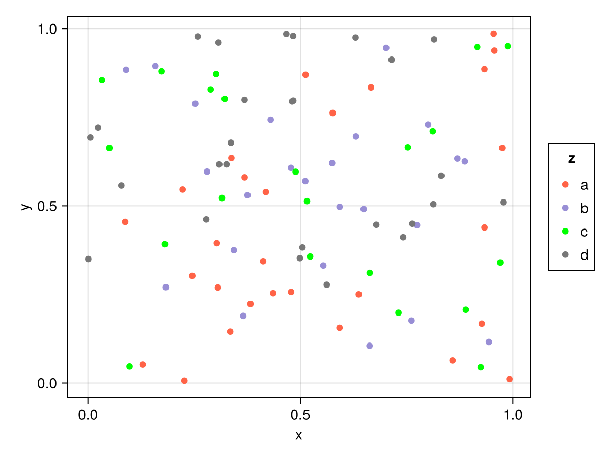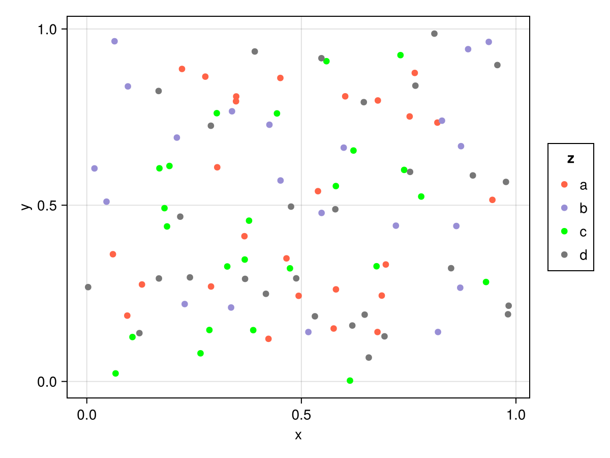 colors = ["a" => :tomato, "c" => :lime, colorant"#988ED5", colorant"#777777"]