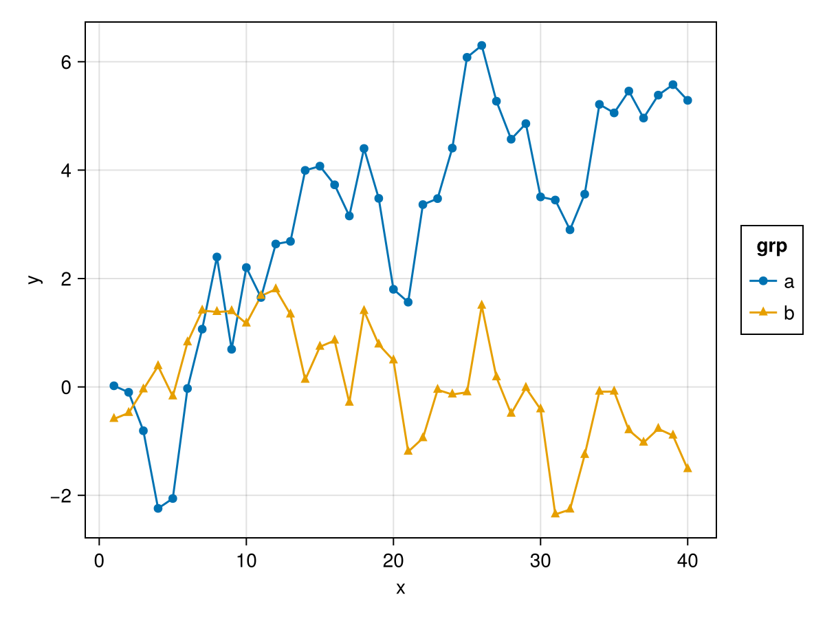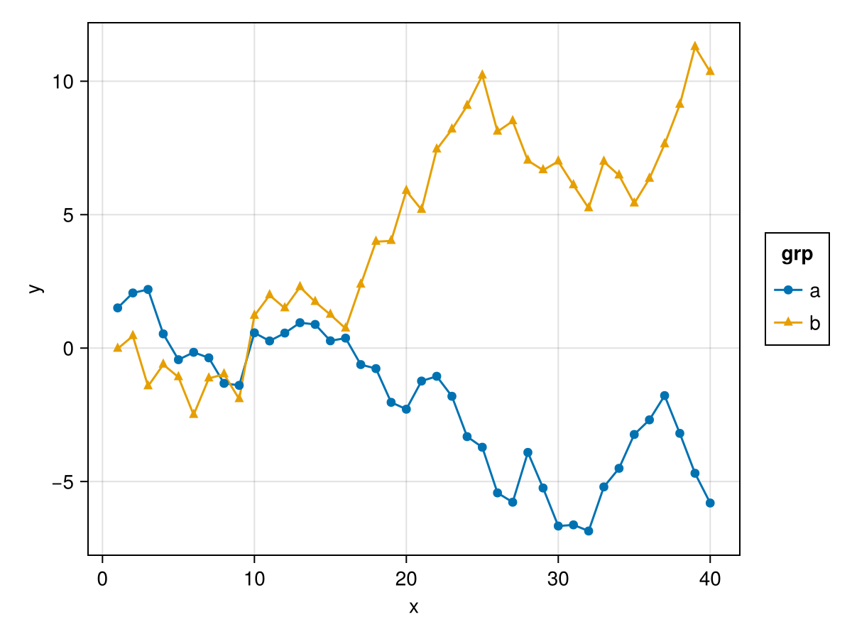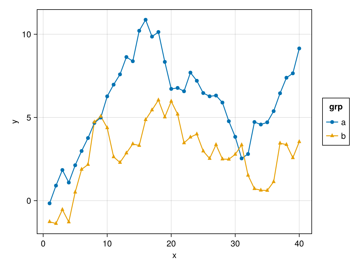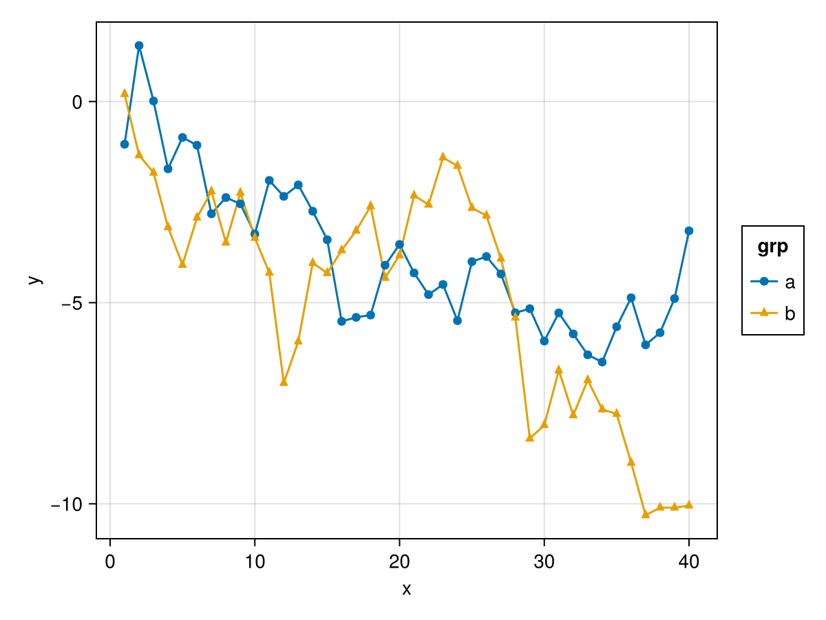 plt = data(df) * layers * mapping(:x, :y, color = :grp)