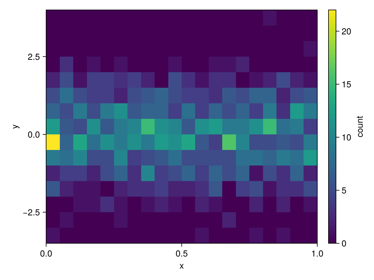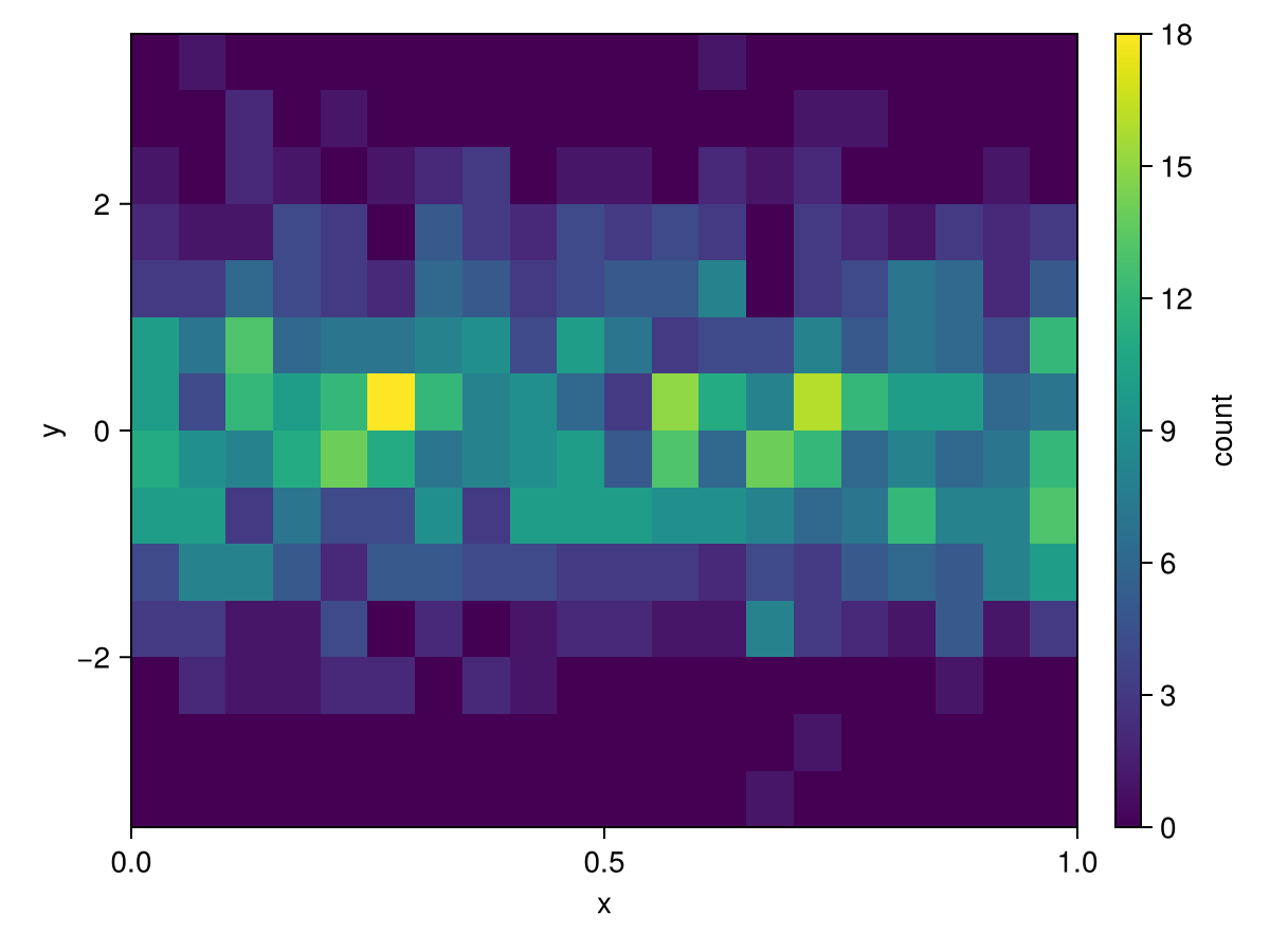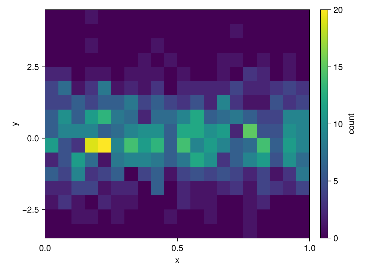 plt = data(df) * mapping(:x, :y) * histogram(bins=20)