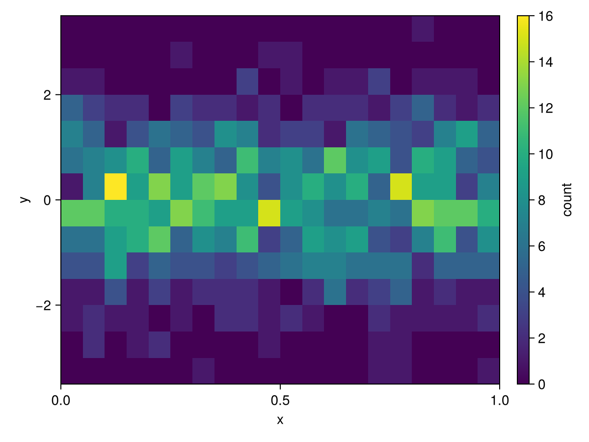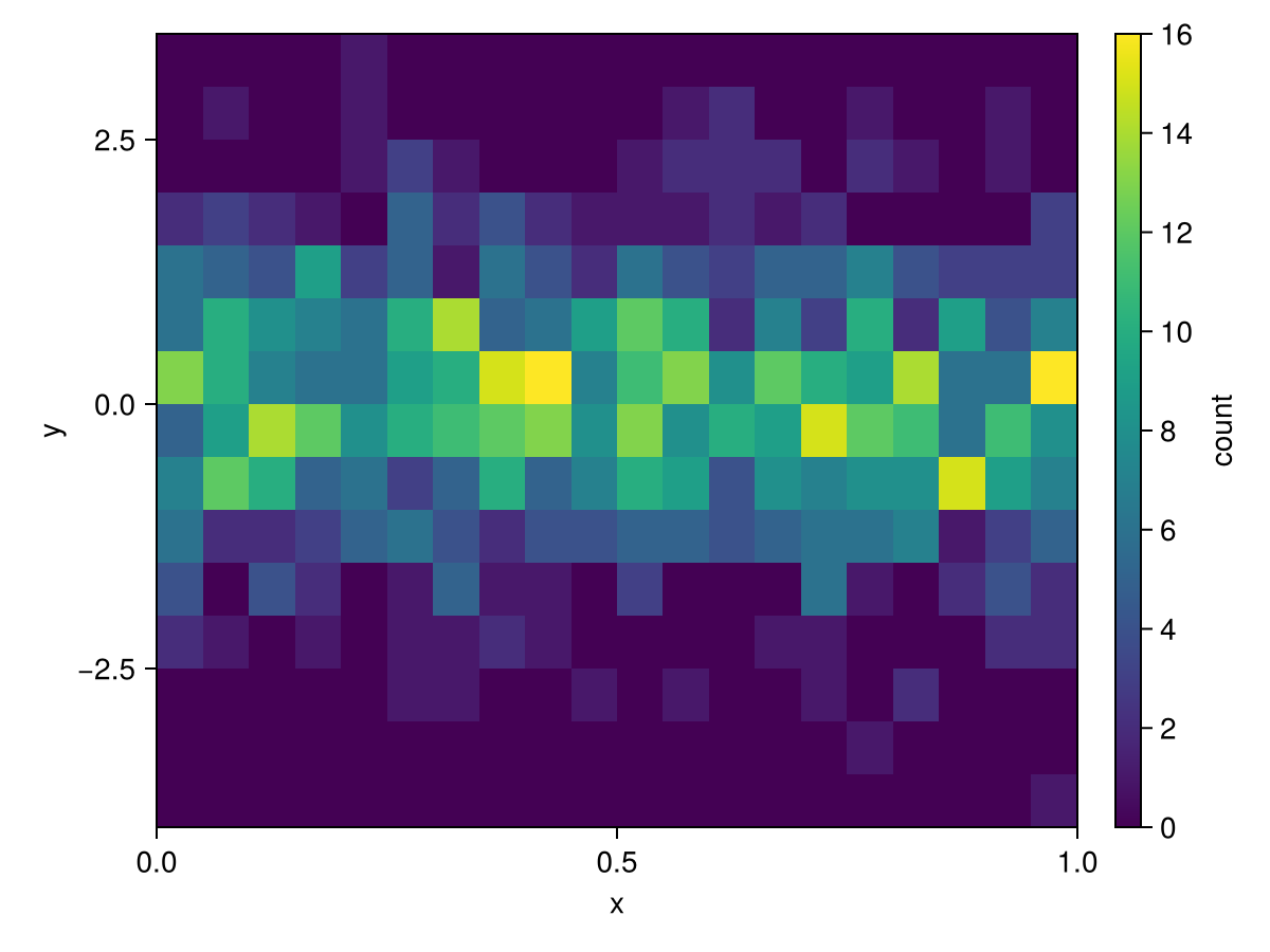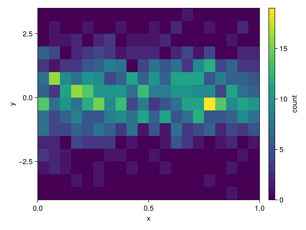 plt = data(df) * mapping(:x, :y) * histogram(bins=20)