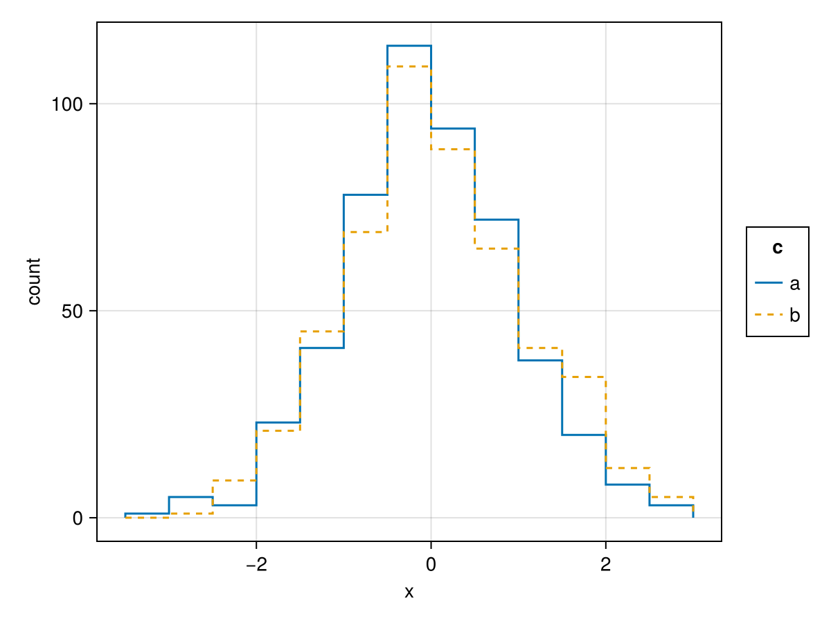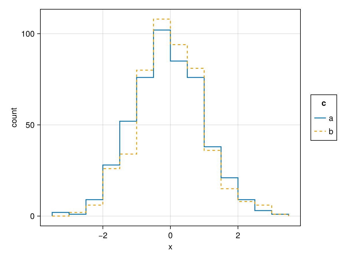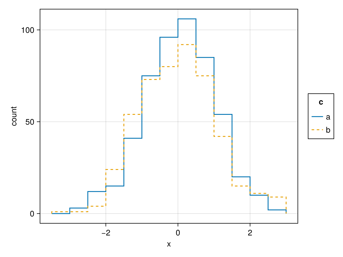 plt = data(df) * mapping(:x, color=:c, linestyle=:c) * histogram(Stairs; bins=20)