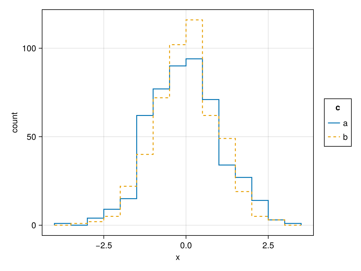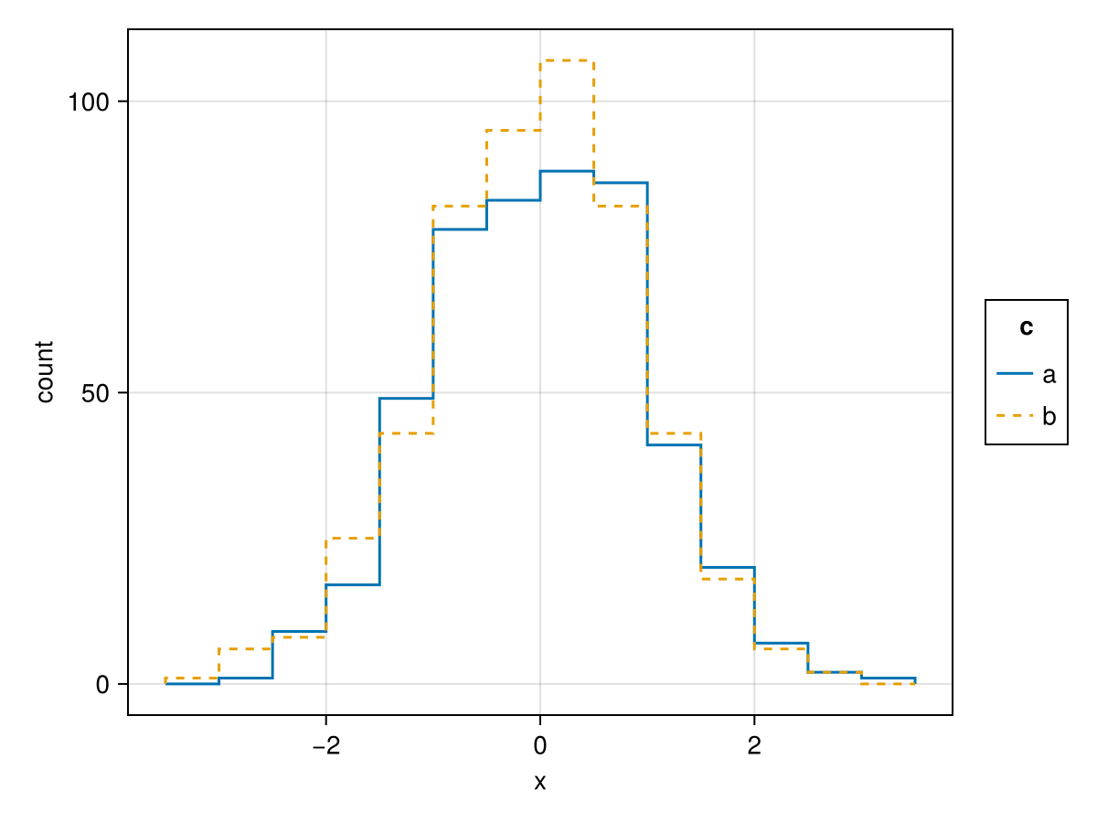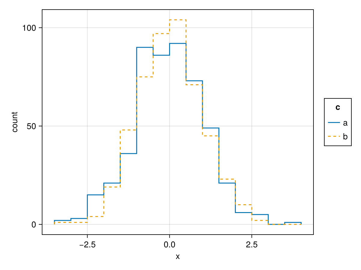 plt = data(df) * mapping(:x, color=:c, linestyle=:c) * histogram(Stairs; bins=20)