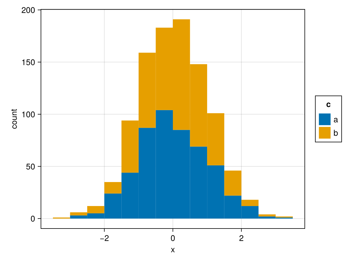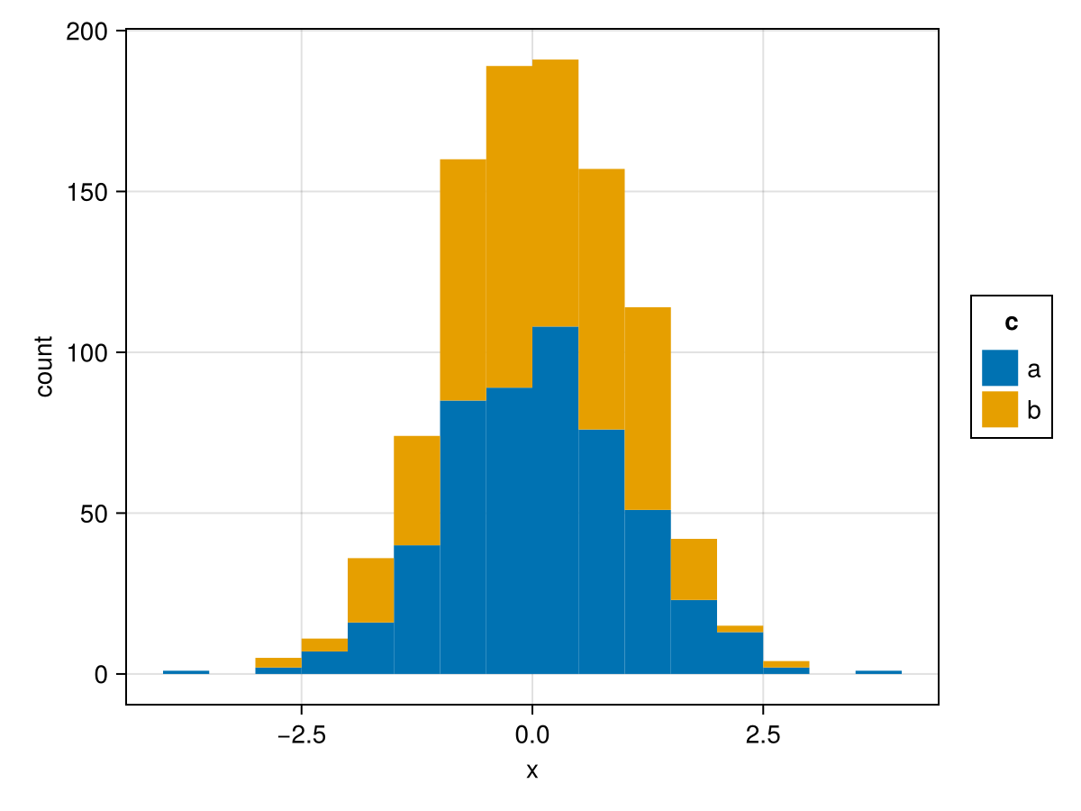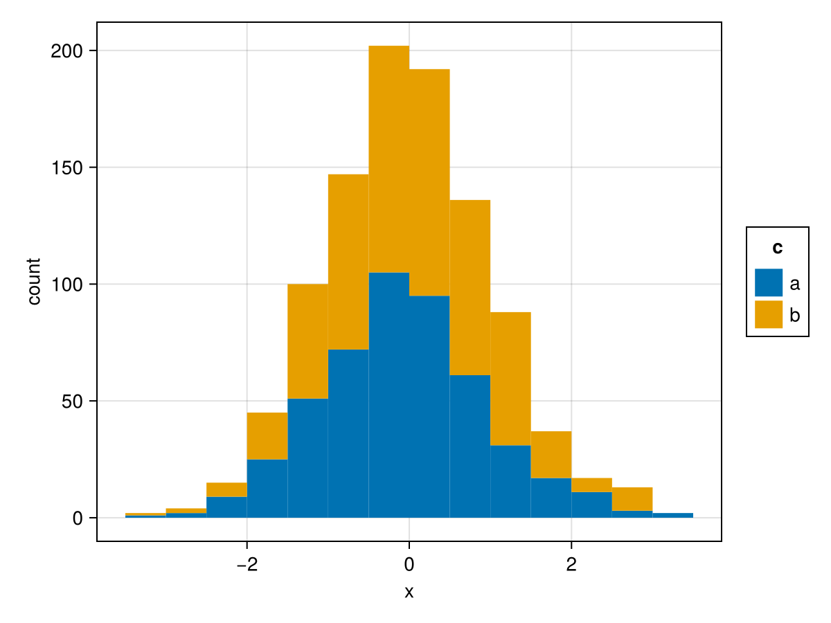 plt = data(df) * mapping(:x, color=:c, stack=:c) * histogram(bins=20)