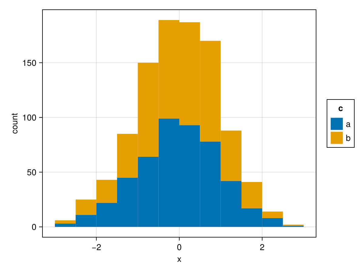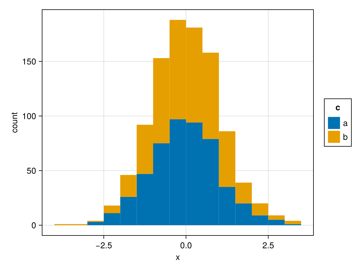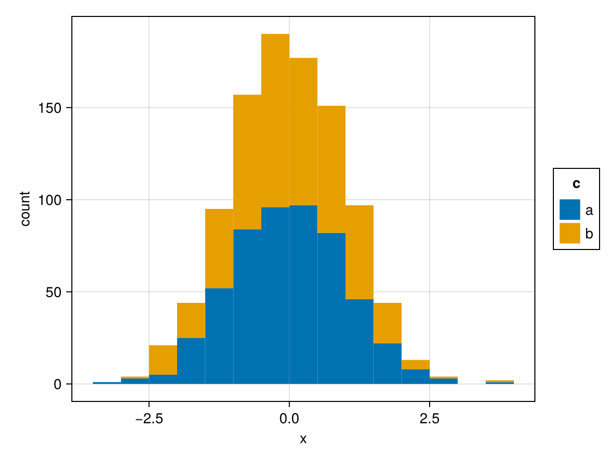 plt = data(df) * mapping(:x, color=:c, stack=:c) * histogram(bins=20)
