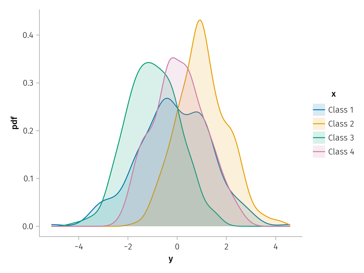We achieve this goal using the distributive properties of addition and multiplication. This is best explained by example. Let us assume that we wish to visually inspect whether a discrete variable :x affects the joint distribution of two continuous variables, :y and :z.