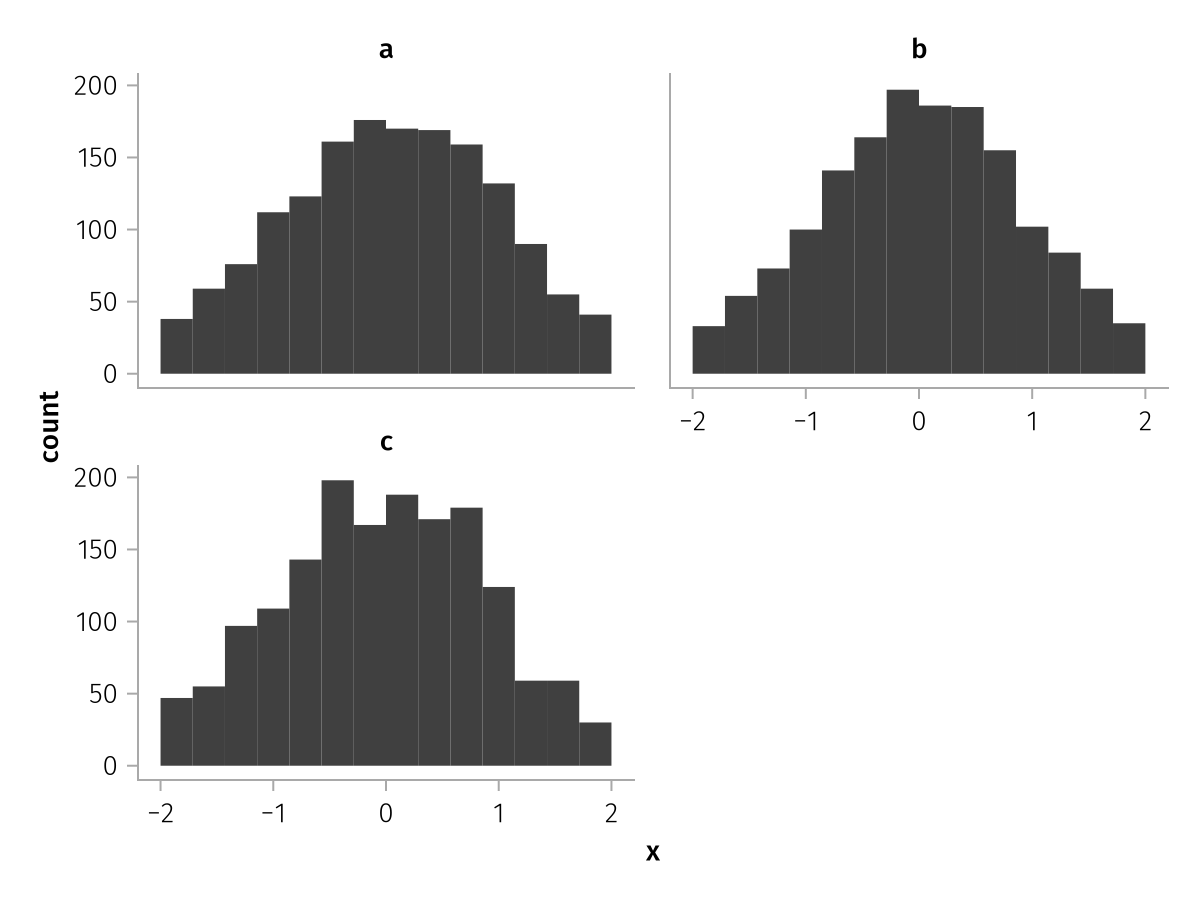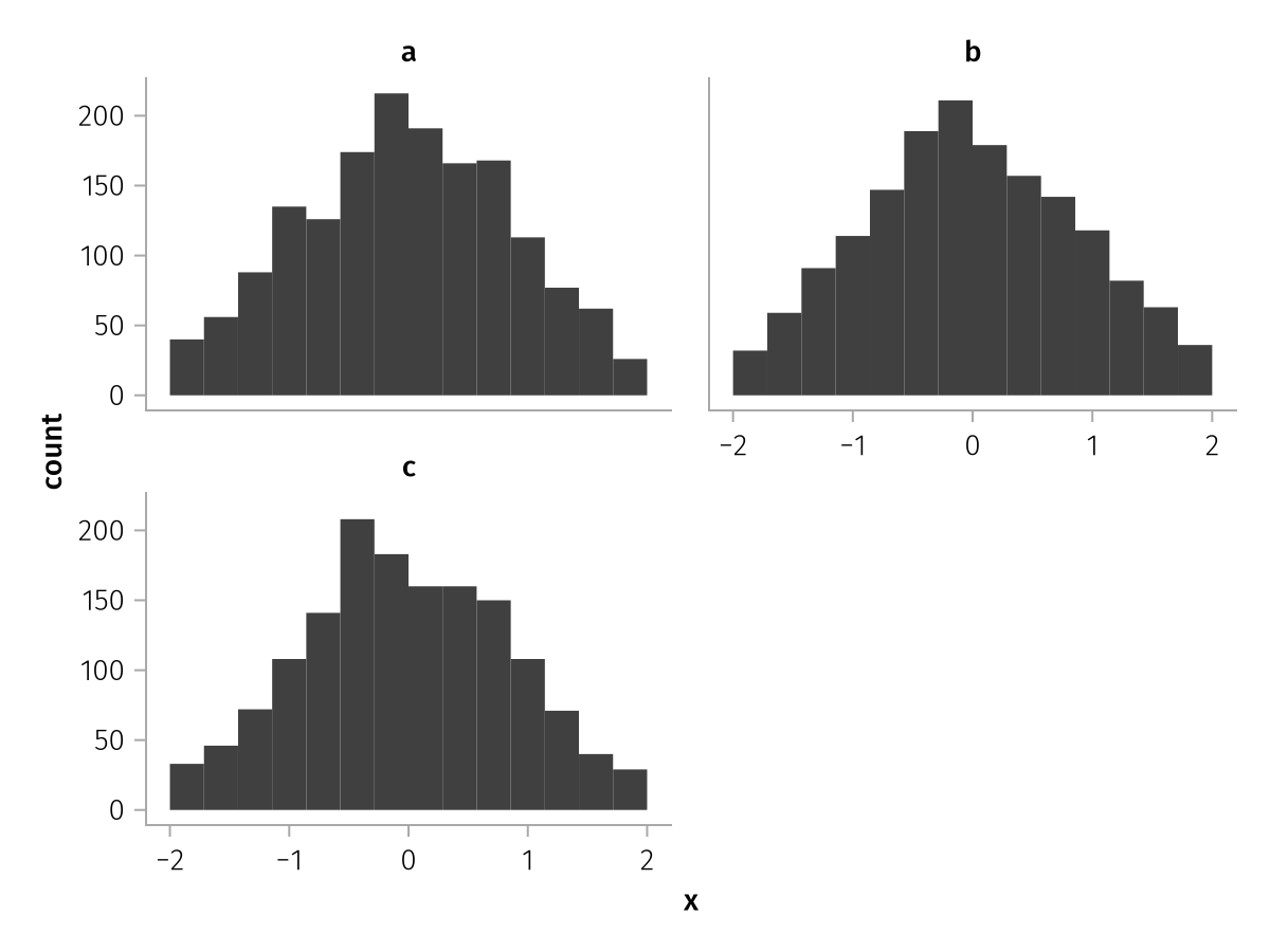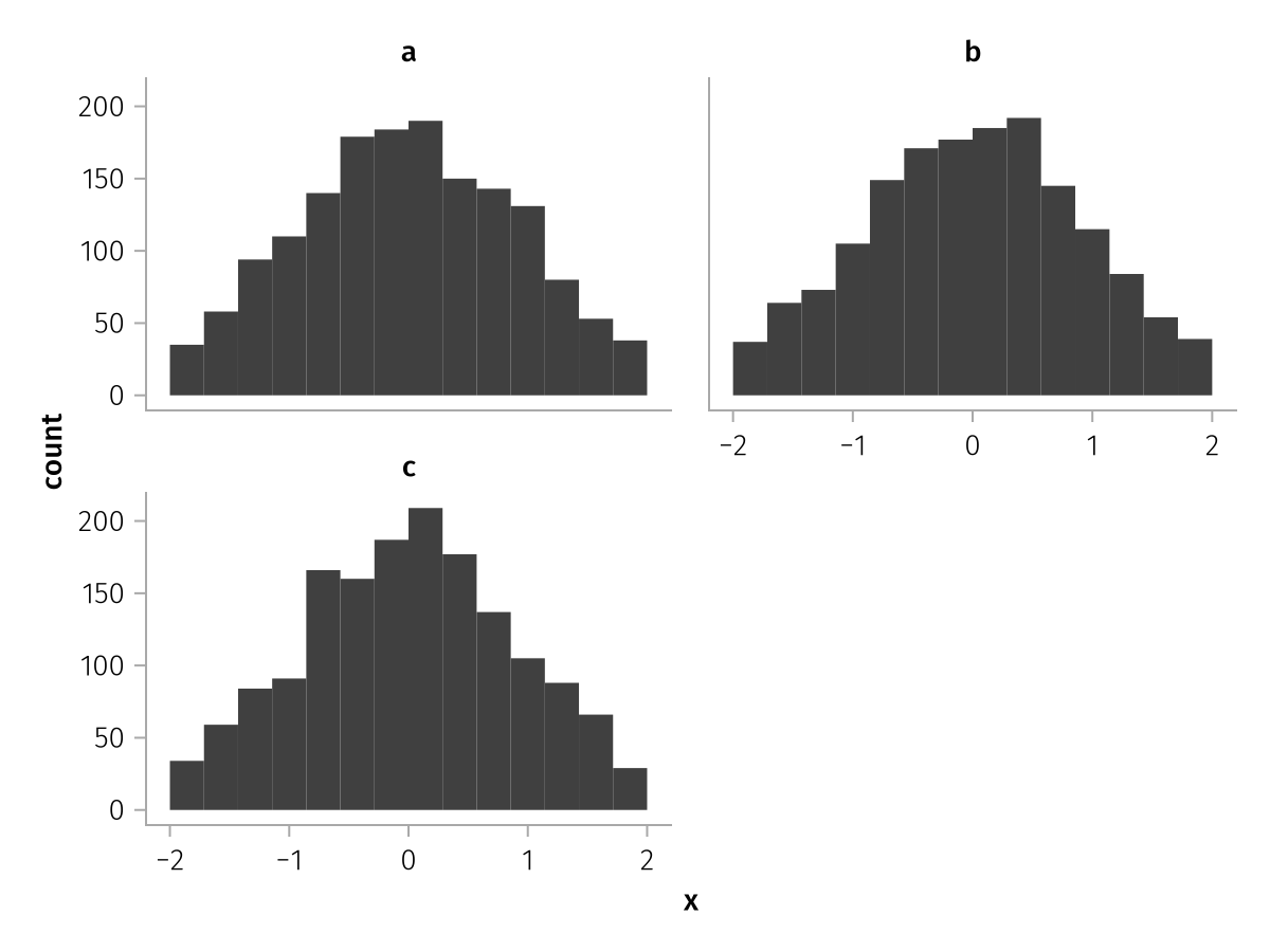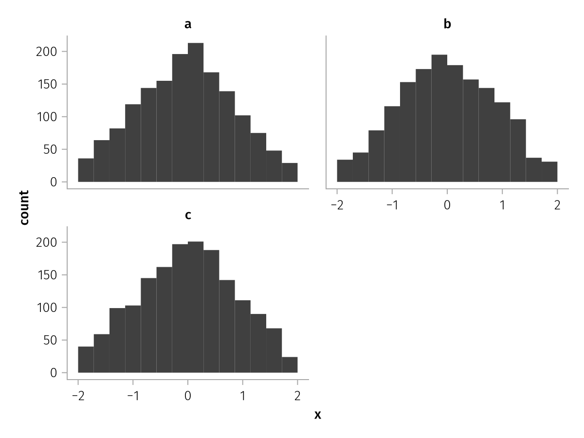 specs = data(df) * mapping(:x, layout=:z) * histogram(bins=range(-2, 2, length=15))