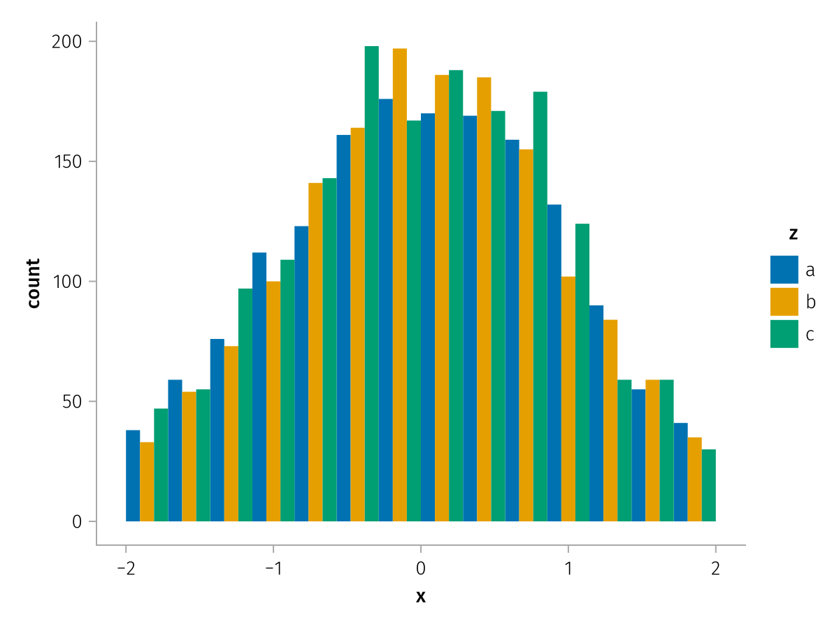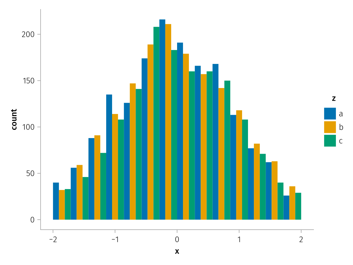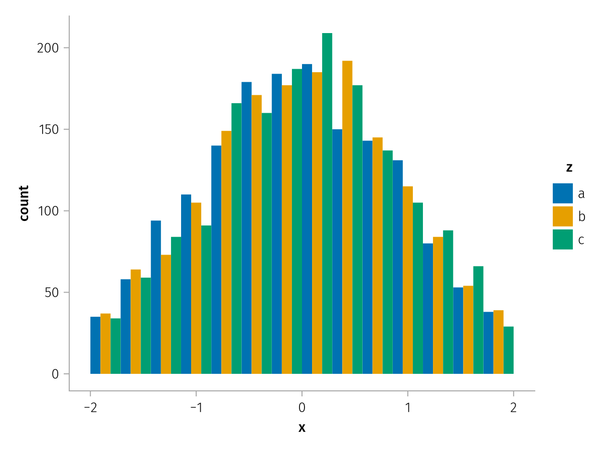 specs = data(df) * mapping(:x, dodge=:z, color=:z) * histogram(bins=range(-2, 2, length=15))