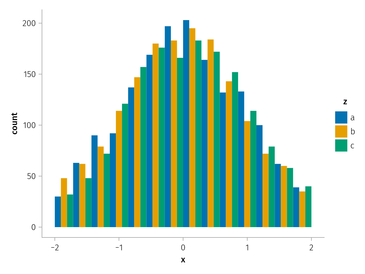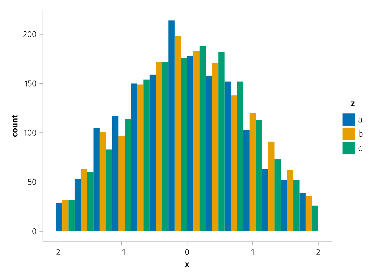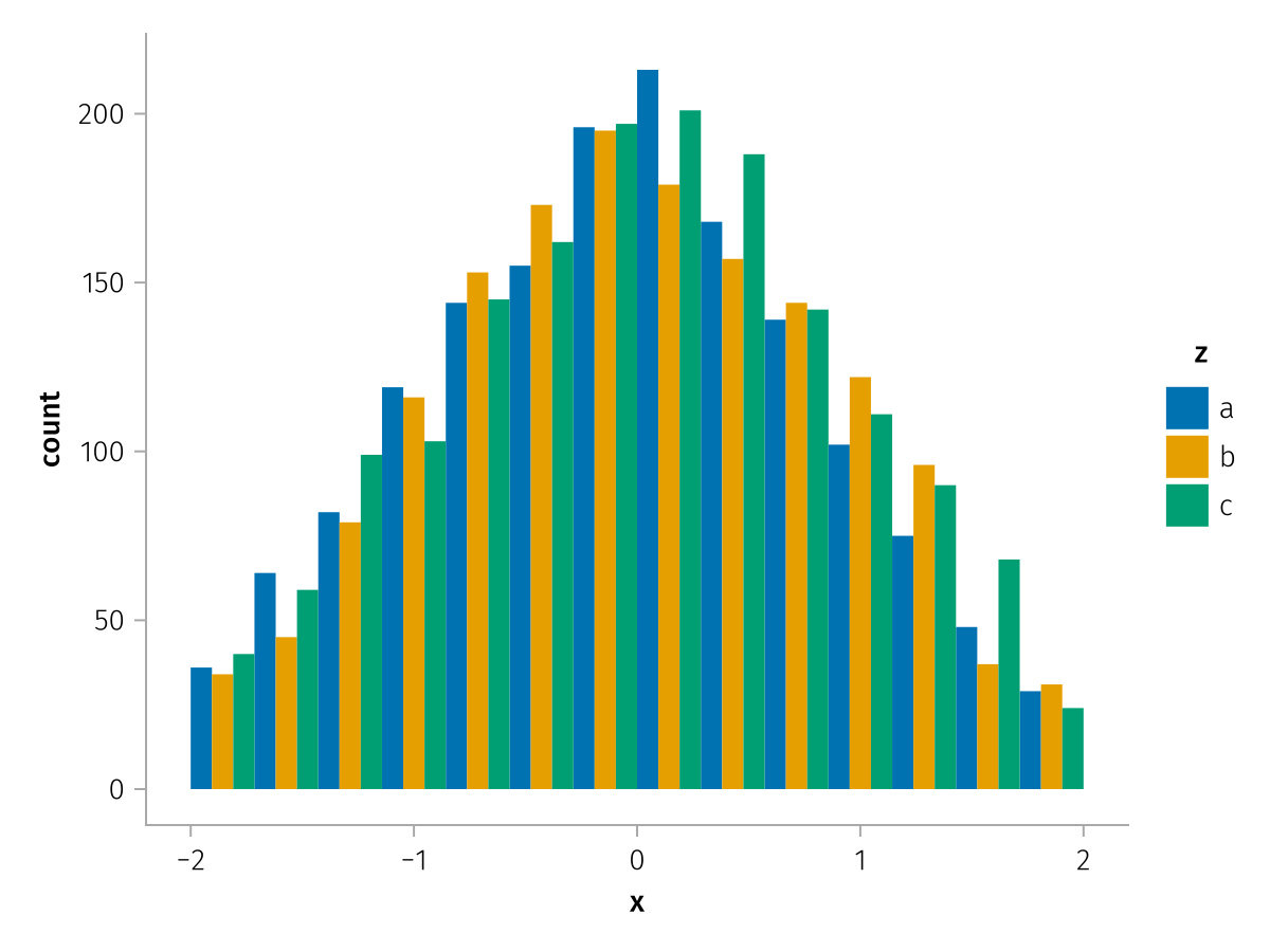 specs = data(df) * mapping(:x, dodge=:z, color=:z) * histogram(bins=range(-2, 2, length=15))